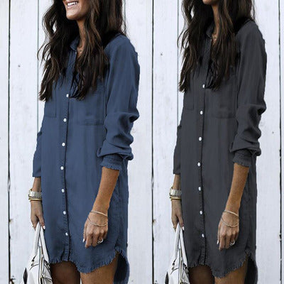Das langärmlige Denim-Kleid mit Knöpfen für Damen vermittelt den Eindruck, in einem übergroßen geknöpften T-Shirt zu faulenzen, und bietet ihm einen stilvollen und leicht verführerischen Look. Sie sind in einigen Farboptionen erhältlich.