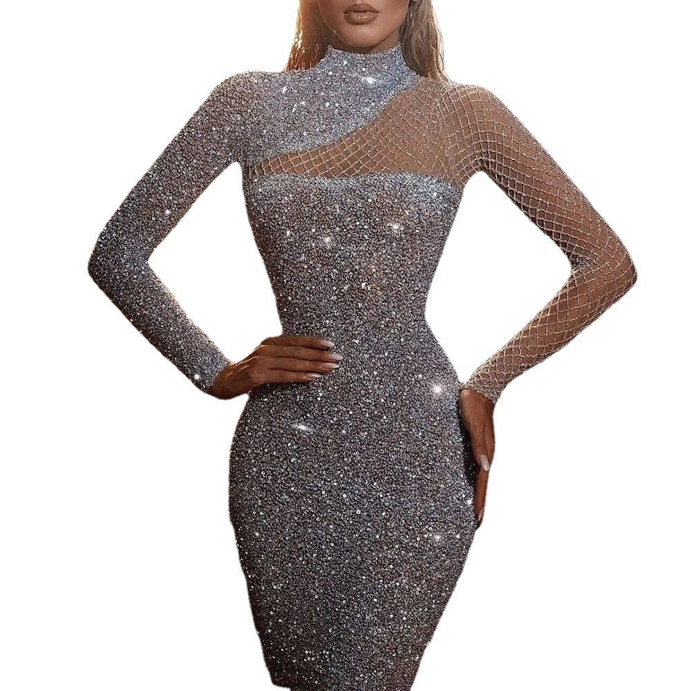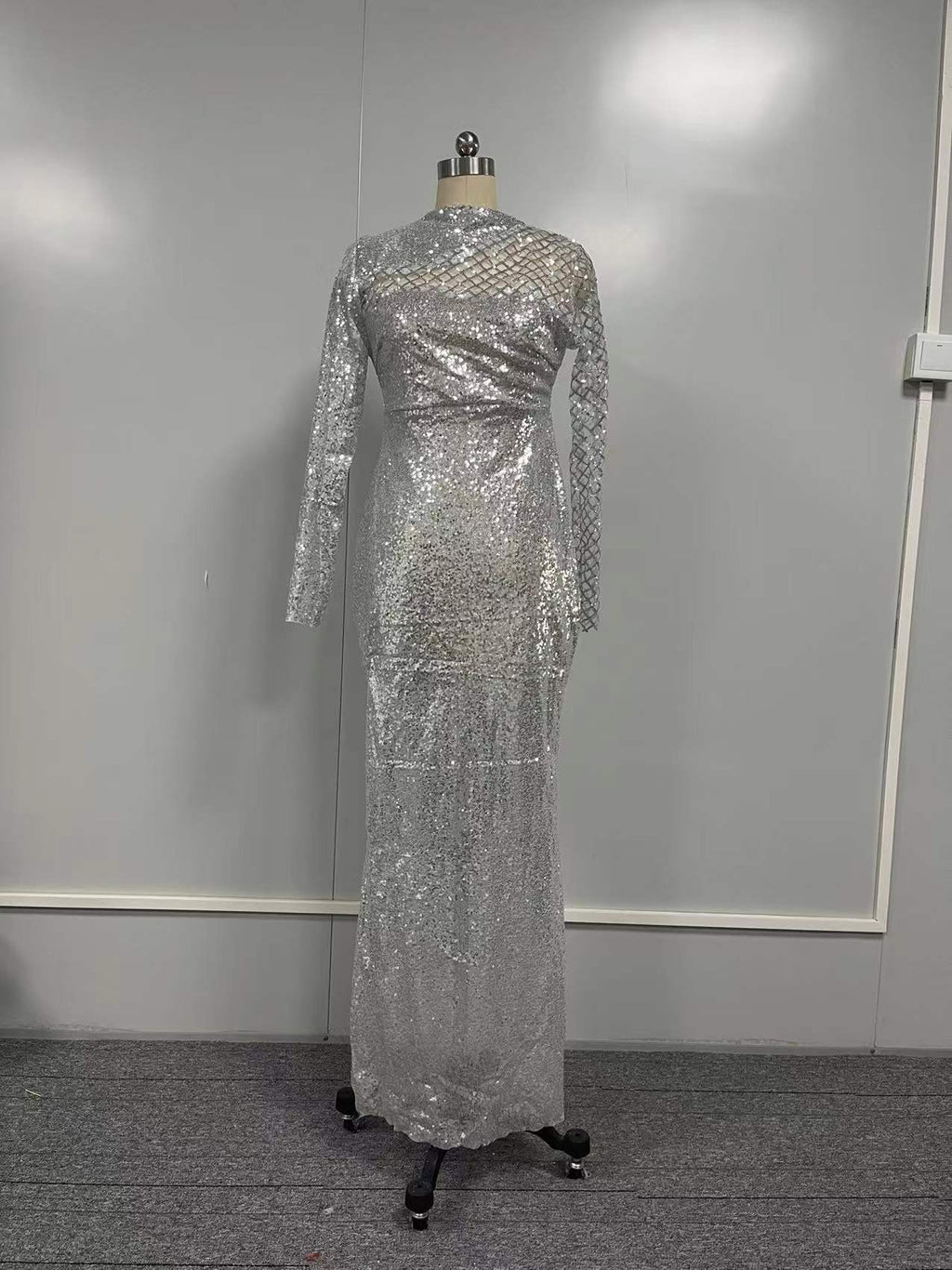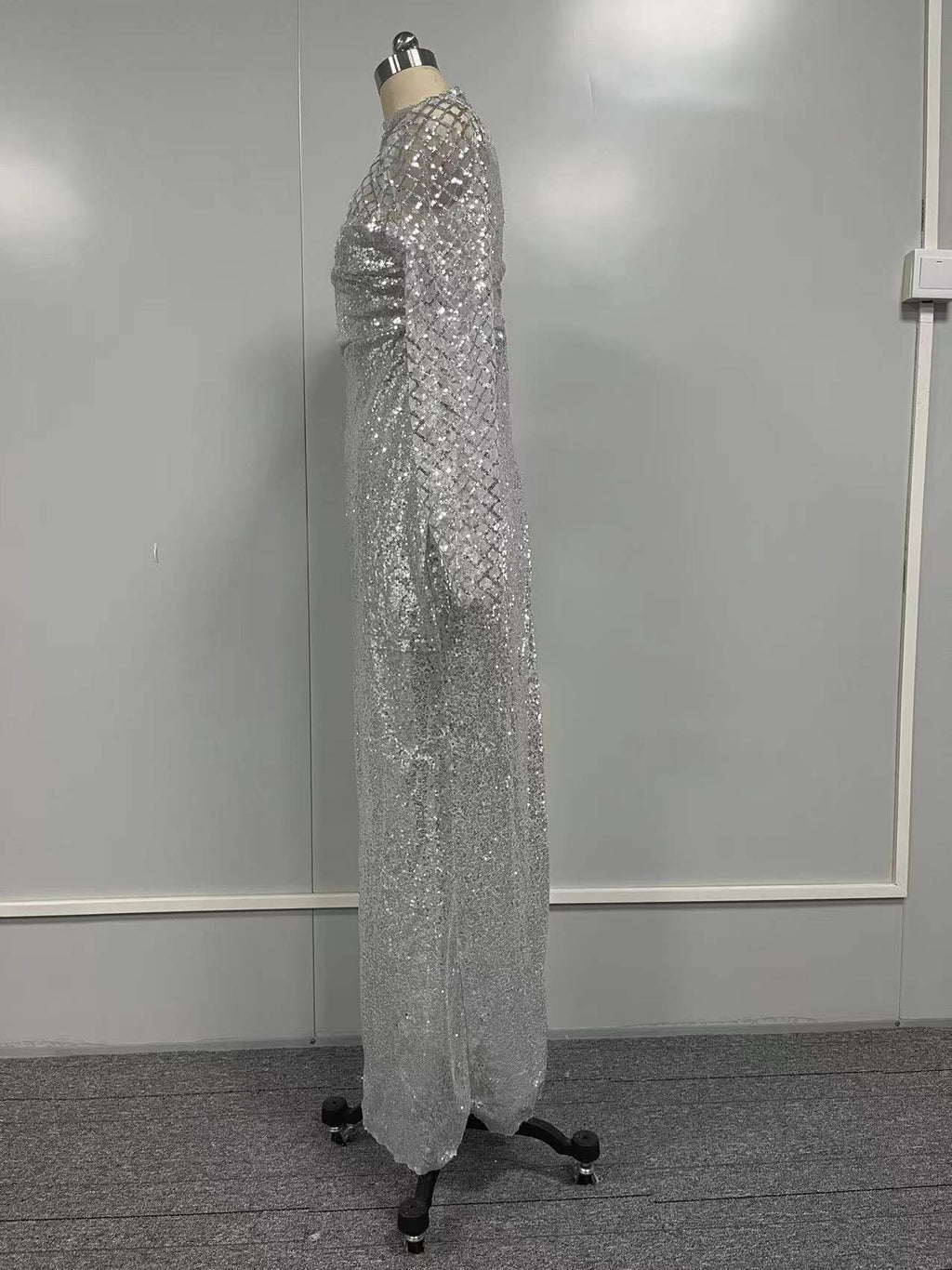 Sehen Sie aus, als gehörten Sie auf den roten Teppich in dem langärmligen Damen-Maxikleid aus Netzstoff und Glitzer-Stoffkragen mit Mesh-Netz entlang des Oberteils und einem der Ärmel und silbrigem Glitzerstoff entlang des Rests.