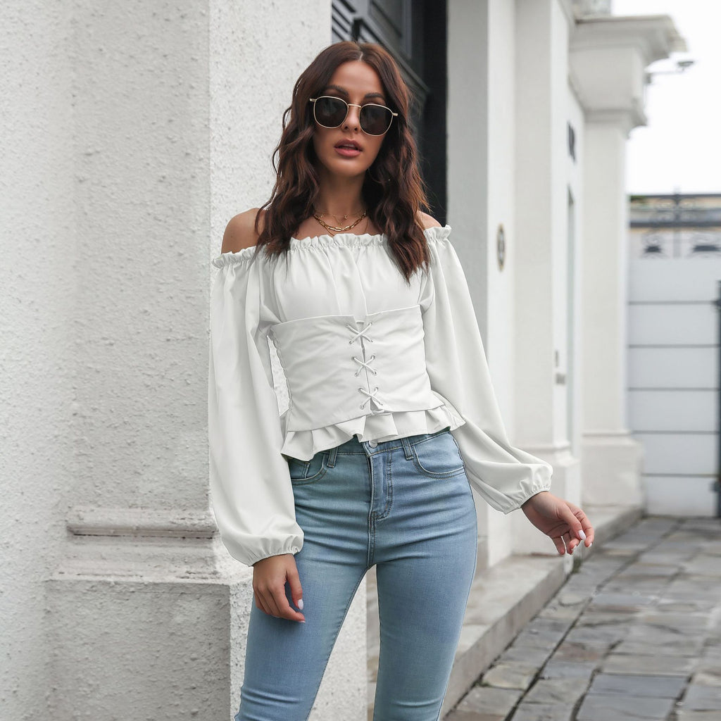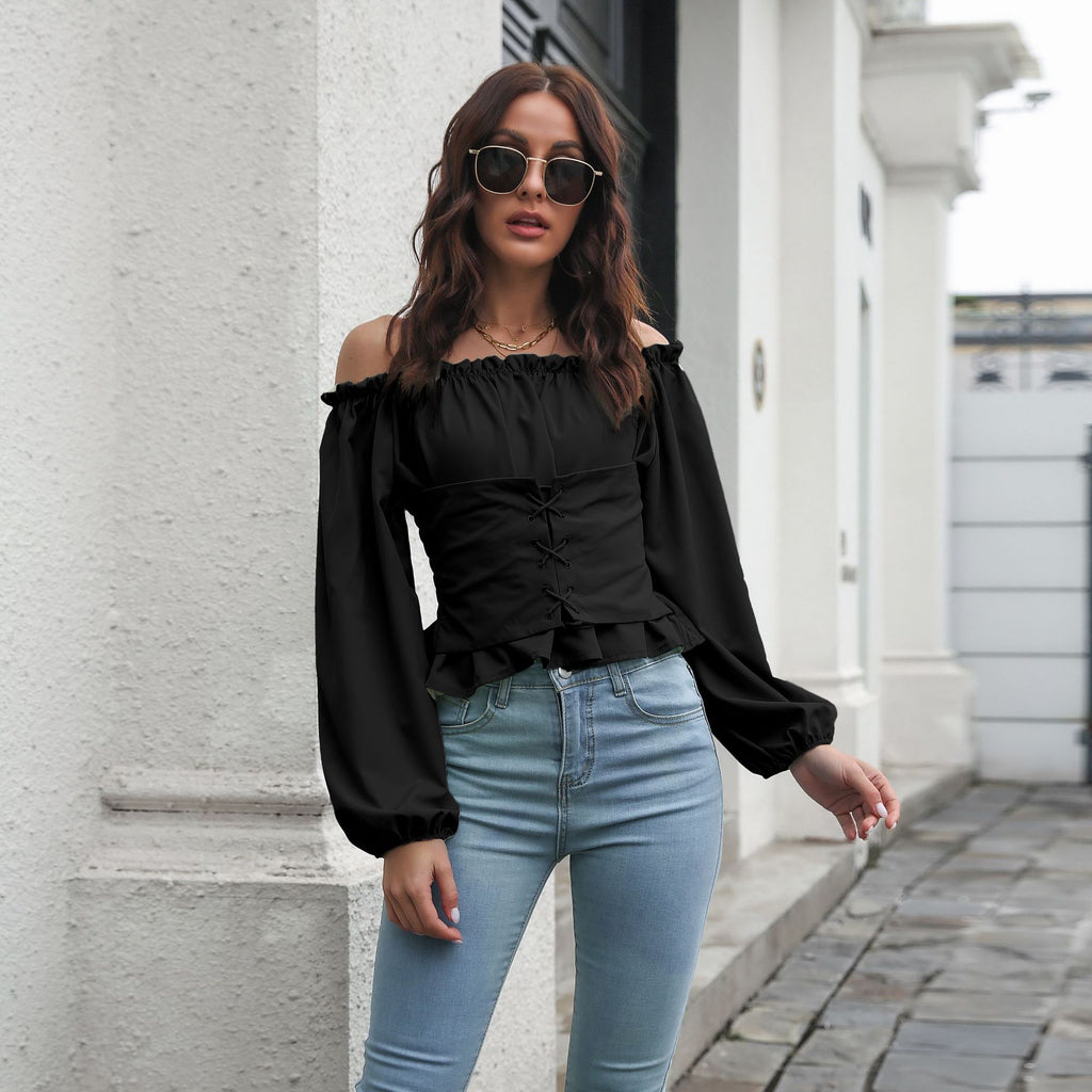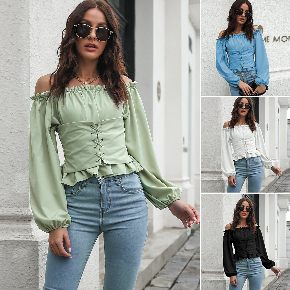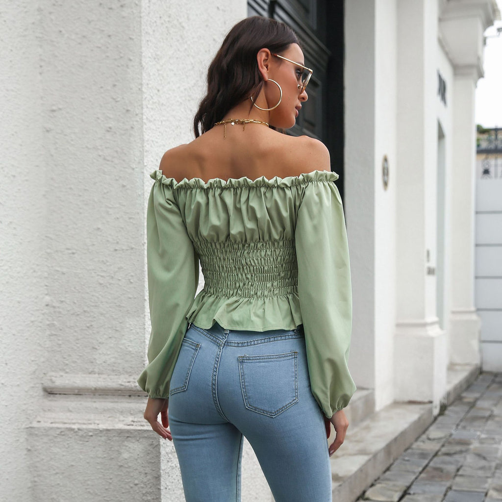 Das langärmlige schulterfreie Damenoberteil mit Rüschensaum bietet eine hübsche Silhouette und eine niedliche Art, sich im Frühling zu kleiden. Wählen Sie aus einer von drei Farben, die der Ästhetik Ihrer gewohnten Garderobe entspricht.