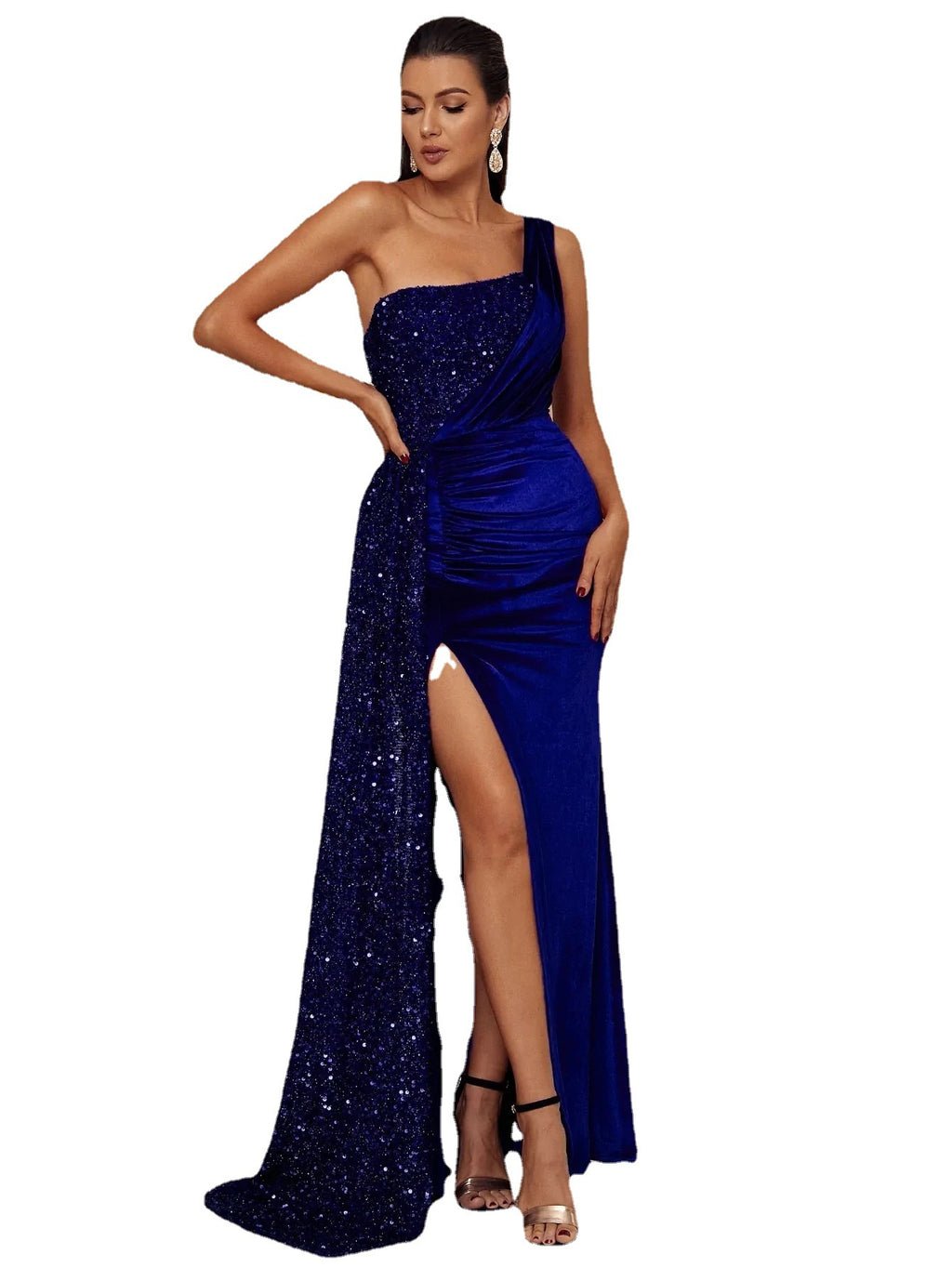 Sehen Sie in der Nacht glamourös aus, wenn Sie dieses lange Damenkleid mit paillettenbesetztem Duster und kalten Schulterärmeln tragen. Es zeichnet sich durch die reiche, dunkle Farbe und den glitzernden Duster aus, komplett mit einem Schlitz an einem Oberschenkel.