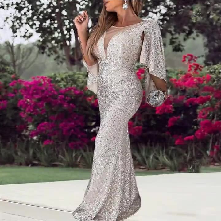 Funkeln Sie im Licht mit dem langärmligen Damen-Maxikleid mit figurbetontem Stoff. Es schimmert mit seinem glitzernden Silberstoff über einer seidigen Champagnerfarbe und hat einen tief ausgeschnittenen V-Ausschnitt.
