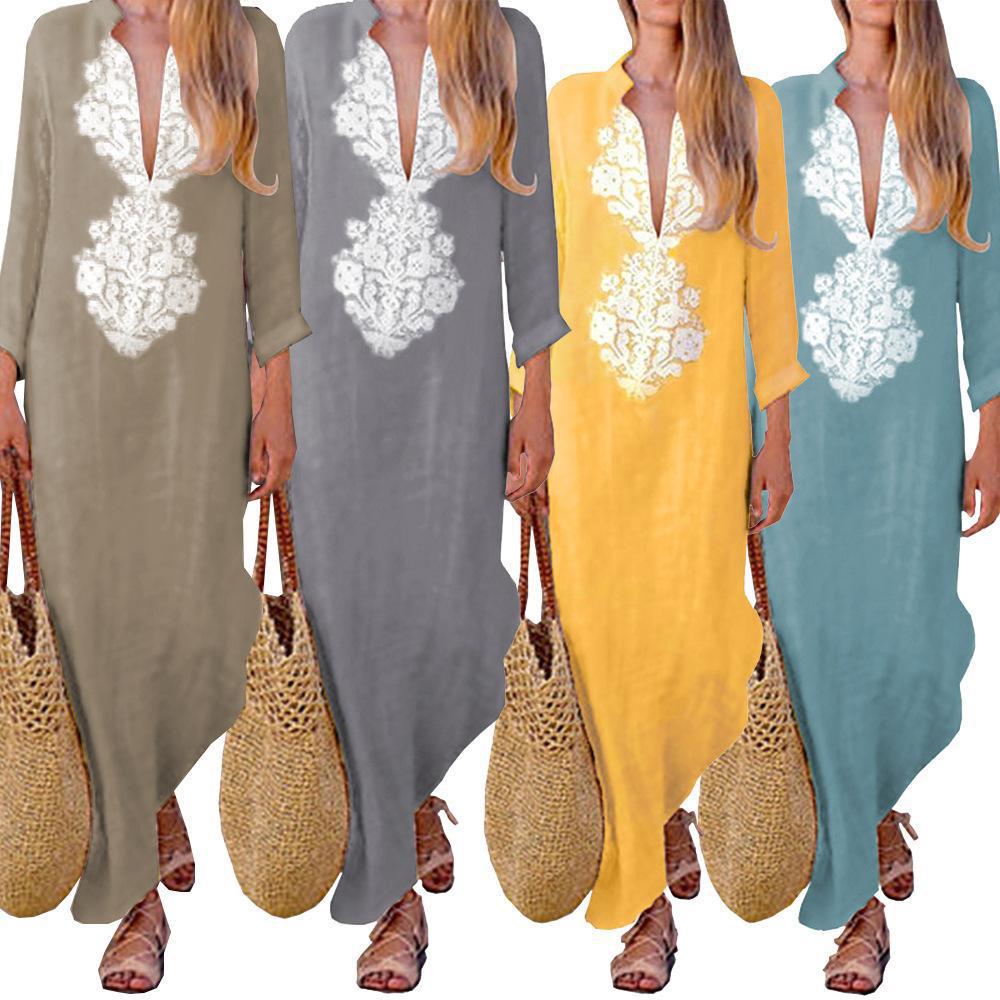 Perfekt für luftige Sommertage, dieses langärmlige Damen-Maxikleid mit steilem V-Ausschnitt ist leicht und farbenfroh. Es zeigt ein kunstvolles Muster auf der Vorderseite, kunstvoll unterbrochen durch den V-Ausschnitt.