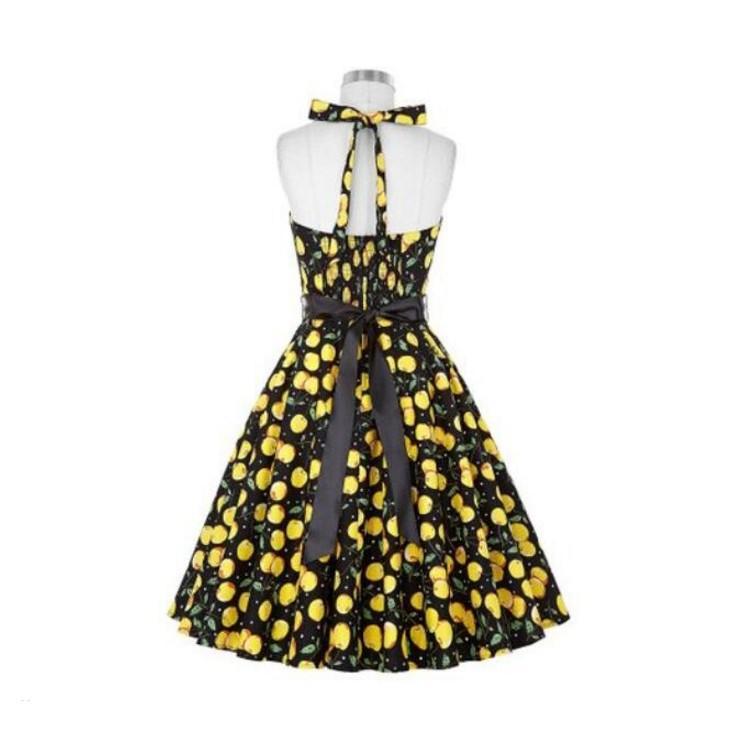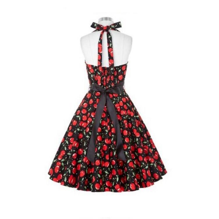 Gönnen Sie sich den Rockabilly-Look, den Sie lieben, mit diesem Retro-Halterkleid mit Yummy-Print, das einen Neckholder und ein zeitloses Kirschmuster aufweist.