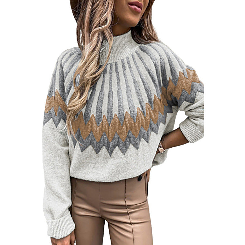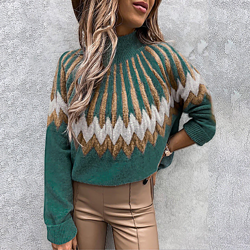 Kleiden Sie sich in diesem Winter und Herbst mit dem locker sitzenden Pullover im antiken Stil mit Rollkragen für Damen, um zu beeindrucken. Es zeichnet sich durch sein Art-déco-inspiriertes Muster entlang des Oberteils und der Ärmel des Pullovers aus.