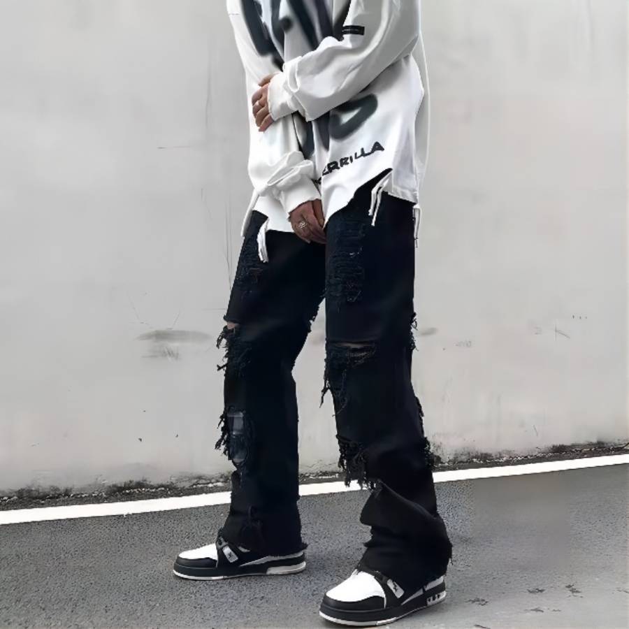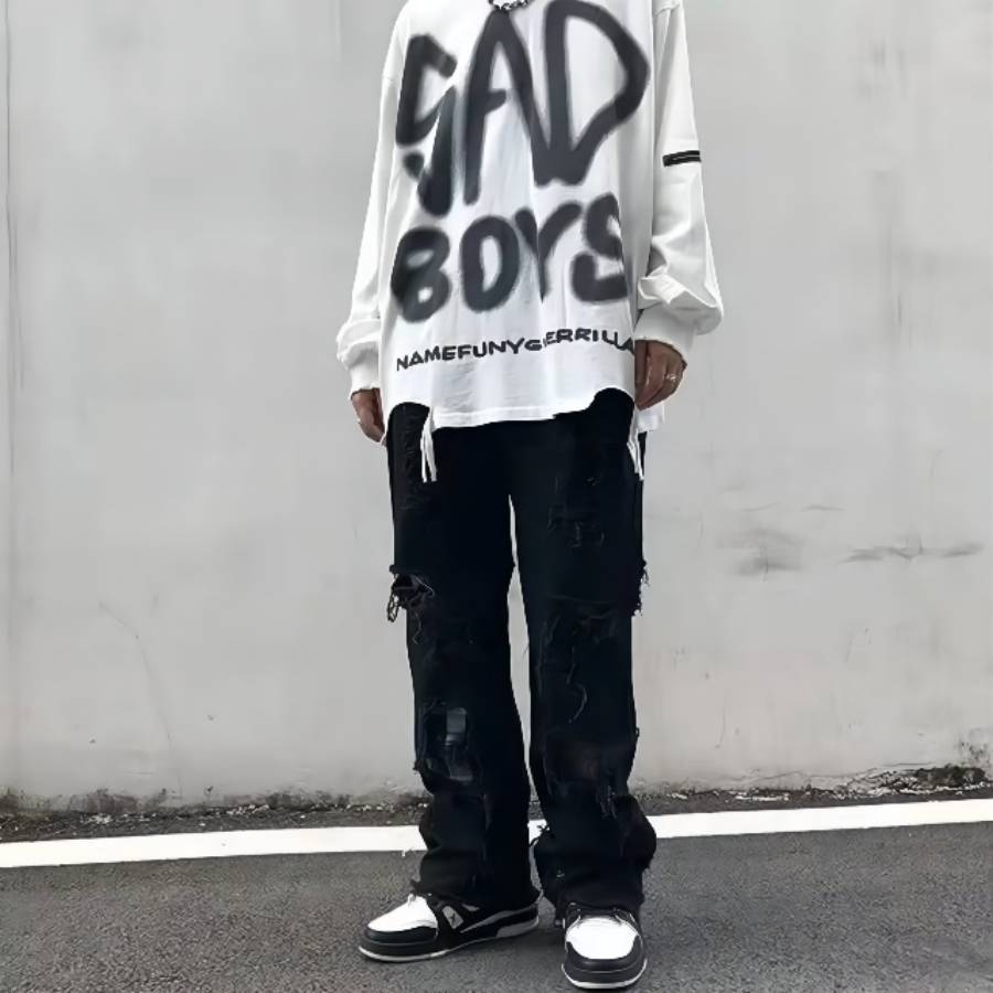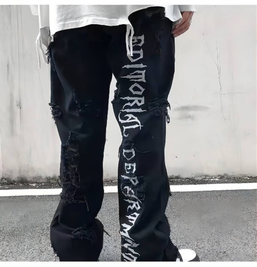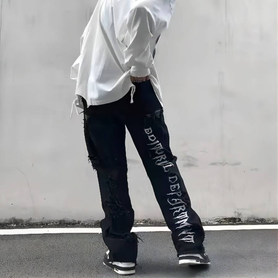 Take your urban style to the next level in the Men’s Baggy Wide Leg Jeans with White Text that runs down the entire length of one leg for an eye-catching touch.