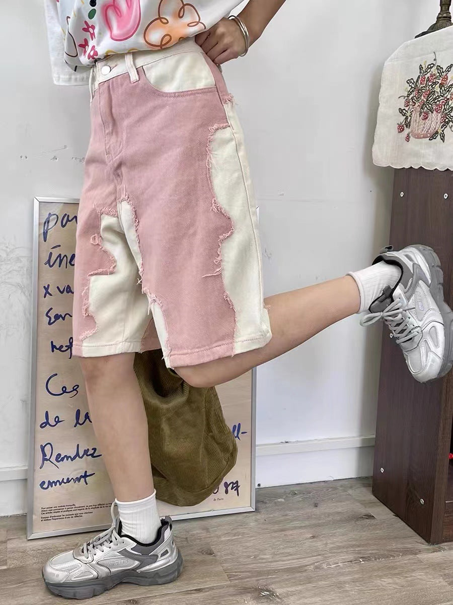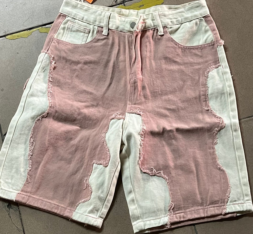 Display your unique personality with the Men’s Long Denim Pink and White Shorts which feature an artistic, abstract section of pink denim over the white.