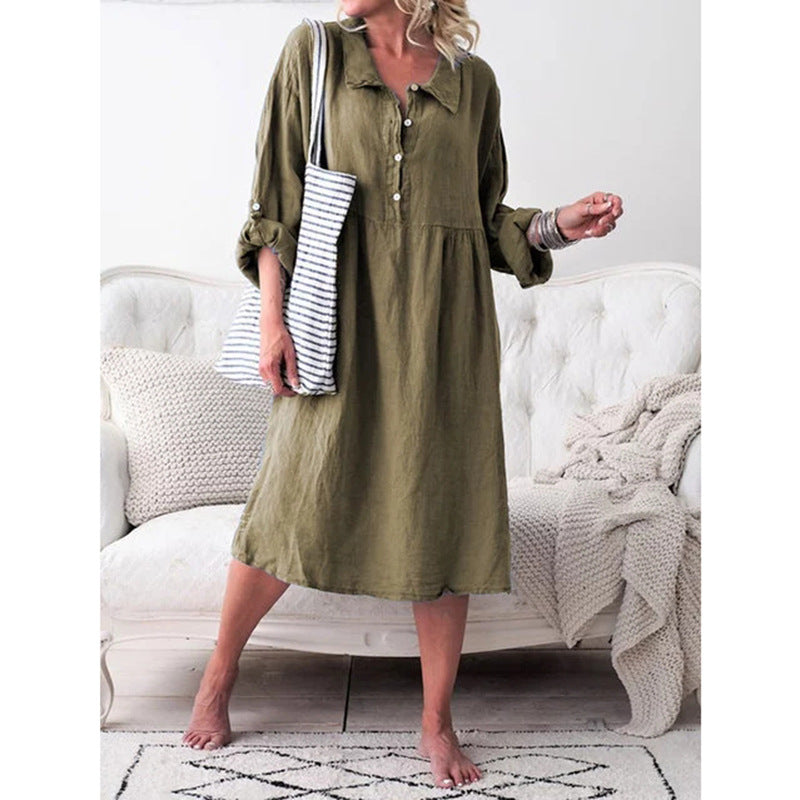 Verschönern Sie Ihre lässigen Brunch-Looks mit dem Damen-Frock-Style-Midikleid mit Umlegekragen. Es hat Knöpfe, die auf der Vorderseite verlaufen und zu denen passen, die über den Ellbogen an den Dreiviertelärmeln positioniert sind.