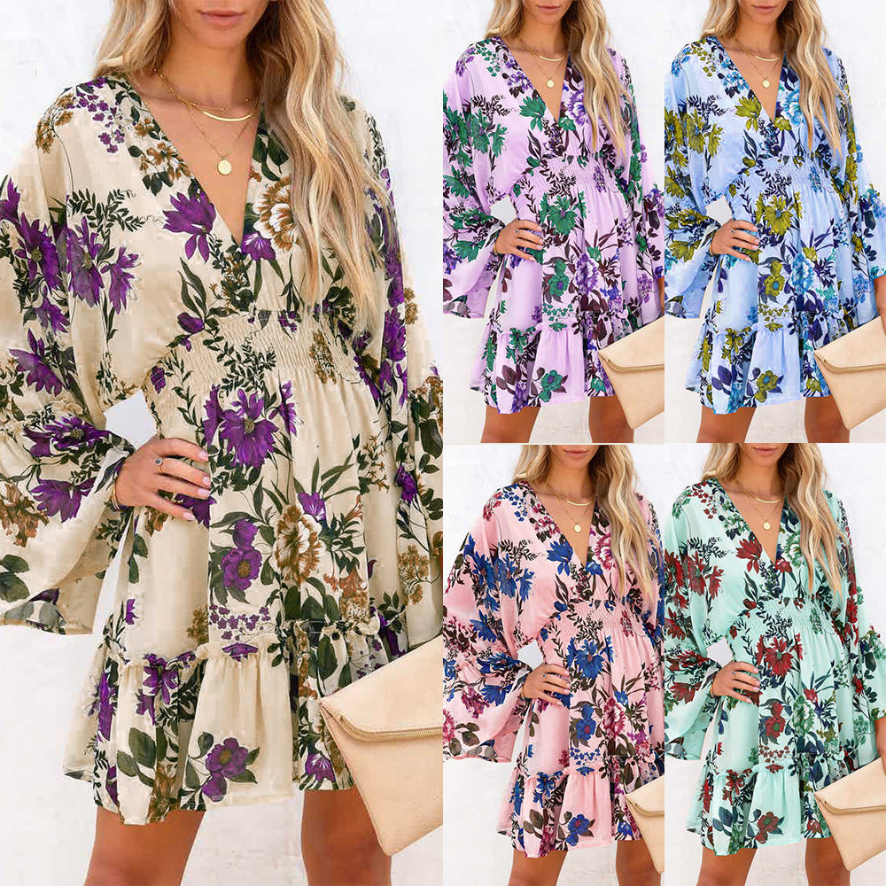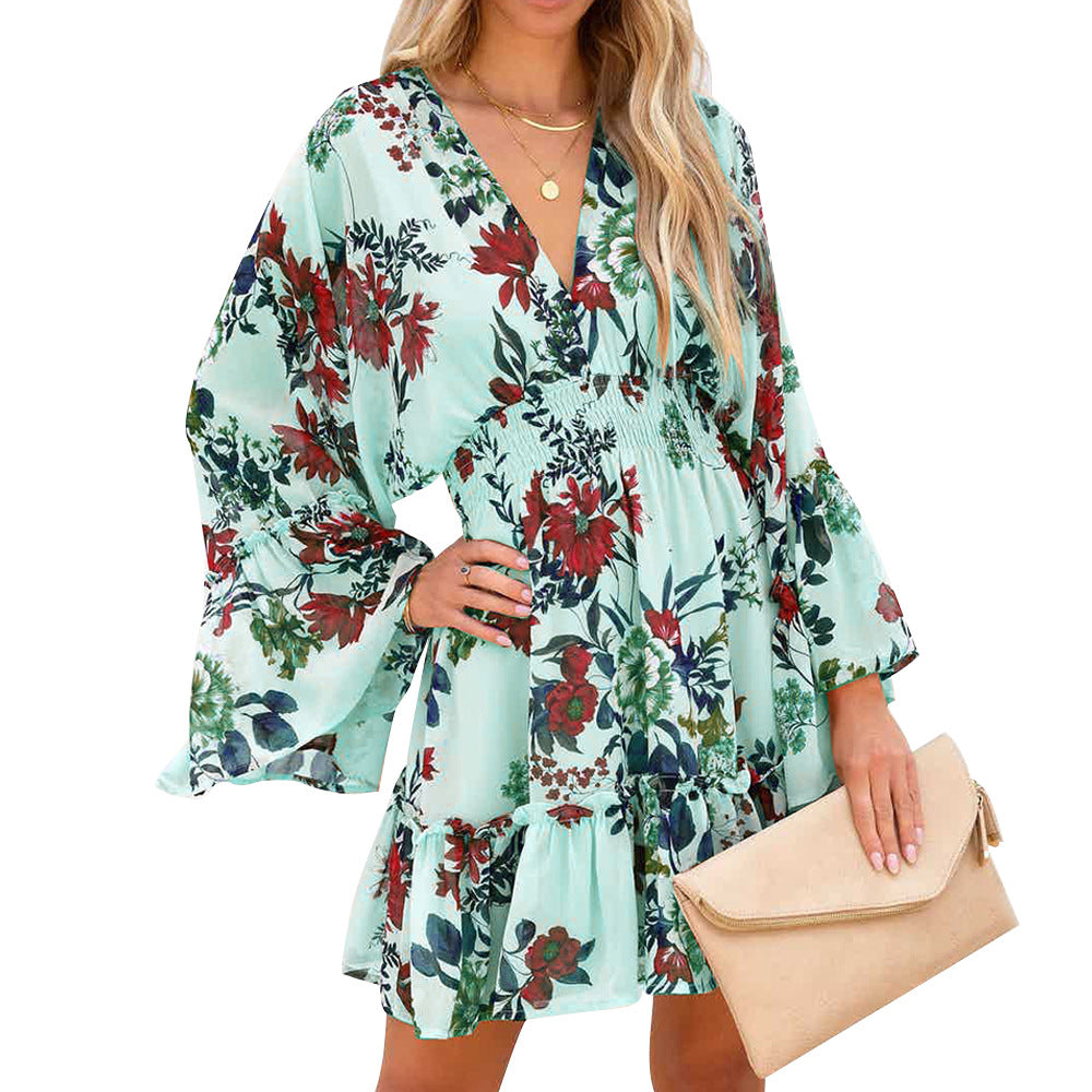 Sehen Sie in Frühlingsfarben süß aus, wenn Sie das Damen-Midikleid mit Glockenärmeln und großem Blumendruck tragen. Dieses Midikleid mit Glockenärmeln hat eine betonte Taille, fließende Glockenärmel und einen tiefen V-Ausschnitt.