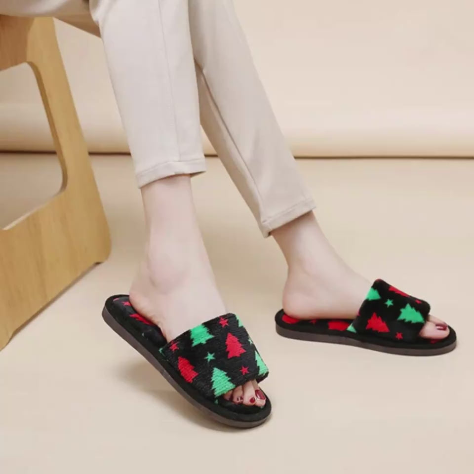 Multicolor Christmas Themed Fleece Open Toed House Shoes