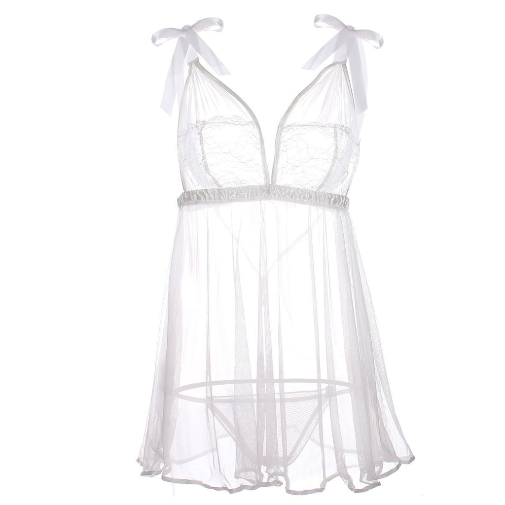 Ein tiefer V-Ausschnitt, ein durchsichtiger BH und verführerische Schleifen an den Trägern machen dieses Peekaboo-Babydoll mit Falten und Schleifen zu einem mühelos sinnlichen Stück.