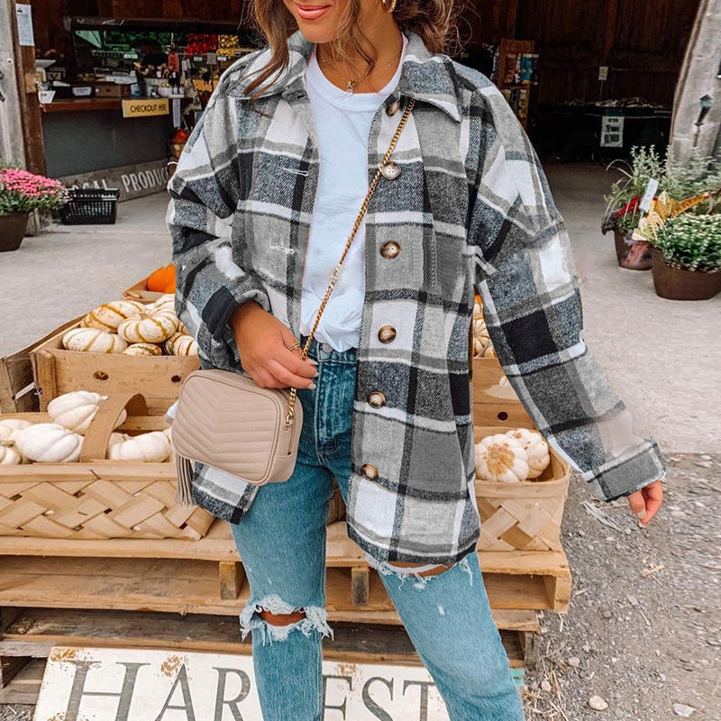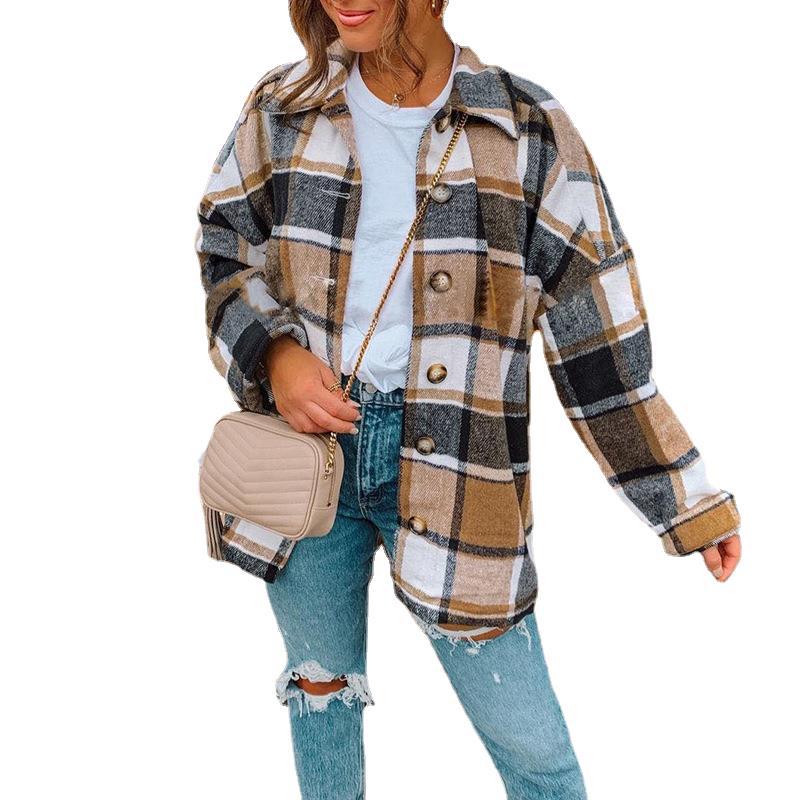 Machen Sie sich bereit für den Herbst, indem Sie das karierte Überhemd für Frauen mit dekorativen großen Knöpfen anziehen. Das Hemd ist in verschiedenen karierten Farbkombinationen erhältlich und verfügt über große Knöpfe als Kontrast dazu. Es hat locker sitzende, bequeme Ärmel.