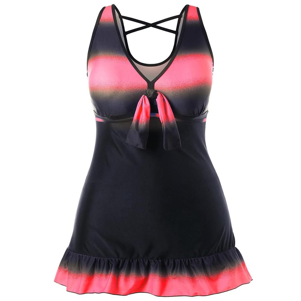 Fühlen Sie sich diesen Sommer selbstbewusst und schön mit Ihren Zehen im Sand in einem Tankini, der wie ein Minikleid aussieht, mit diesem Plus Size Tankini mit Rock und Boyshorts.