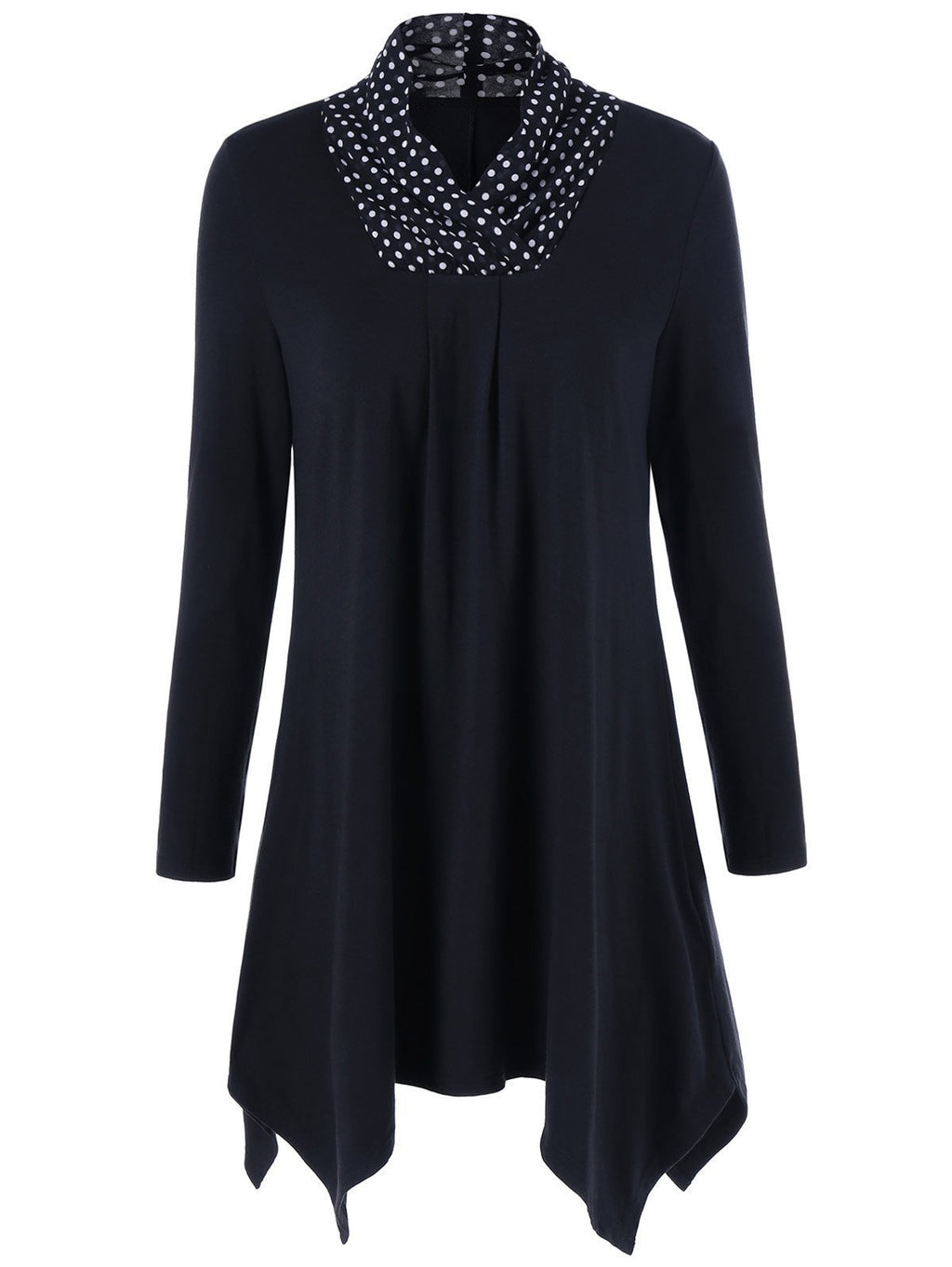 Der Polka Dot Scarf High-Low Sweater ist ein High-Low-Pullover mit Zipfelsaum, Schalkragen und kuscheligen langen Ärmeln, der sich perfekt für den Herbst eignet.