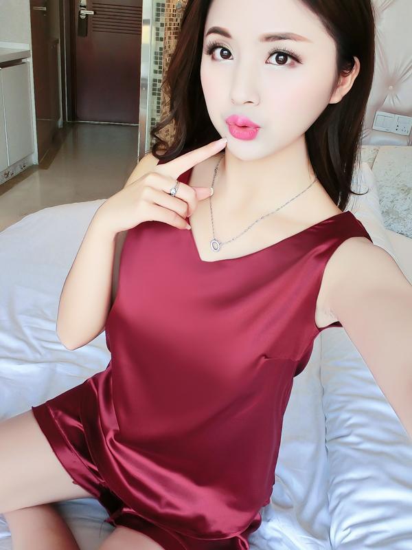 Dieses zweiteilige Pyjama-Set besteht aus einem Paar seidiger Shorts mit Rüschenbesatz und einem Tanktop mit V-Ausschnitt.