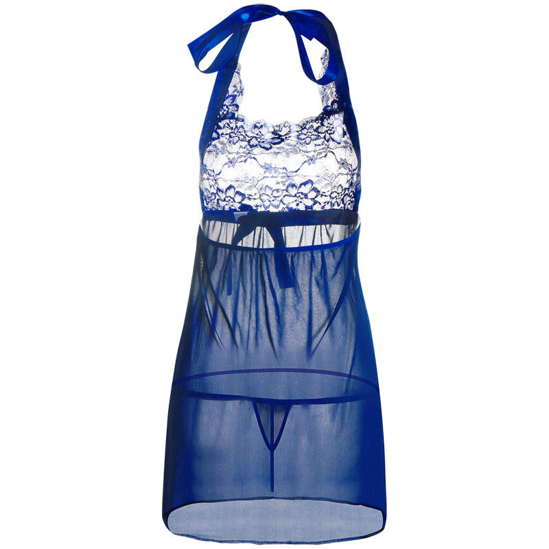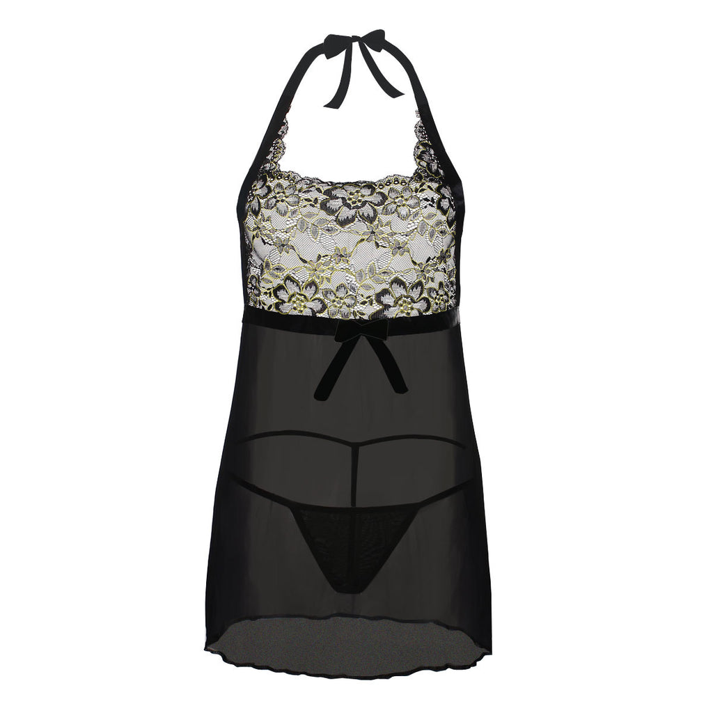 Schlicht und schick, das Neckholder-Babydoll-Set mit Satin-Schleife und Spitzenoberteil verfügt über ein Spitzen-Dekolleté mit einem durchsichtigen Netzrock, der garantiert romantische Gedanken weckt.