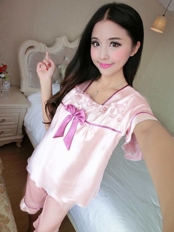 Dieses Pyjama-Set mit Rüschen ist mit einer Schleife und einer hübschen Blumenapplikation verziert und wurde entworfen, um Damen zu gefallen, die es lieben, sich zu entspannen.
