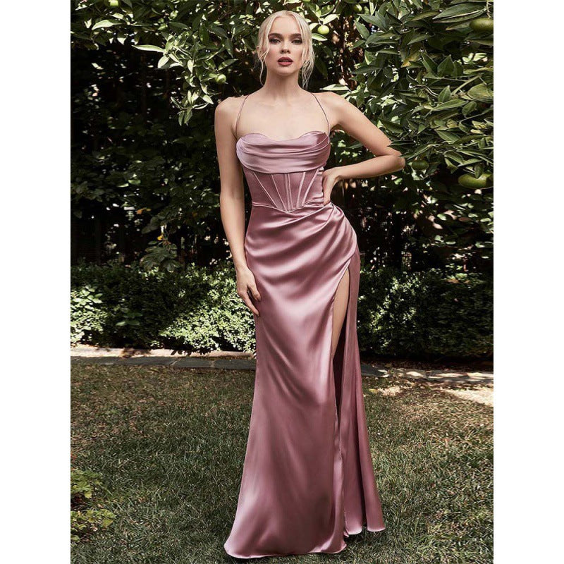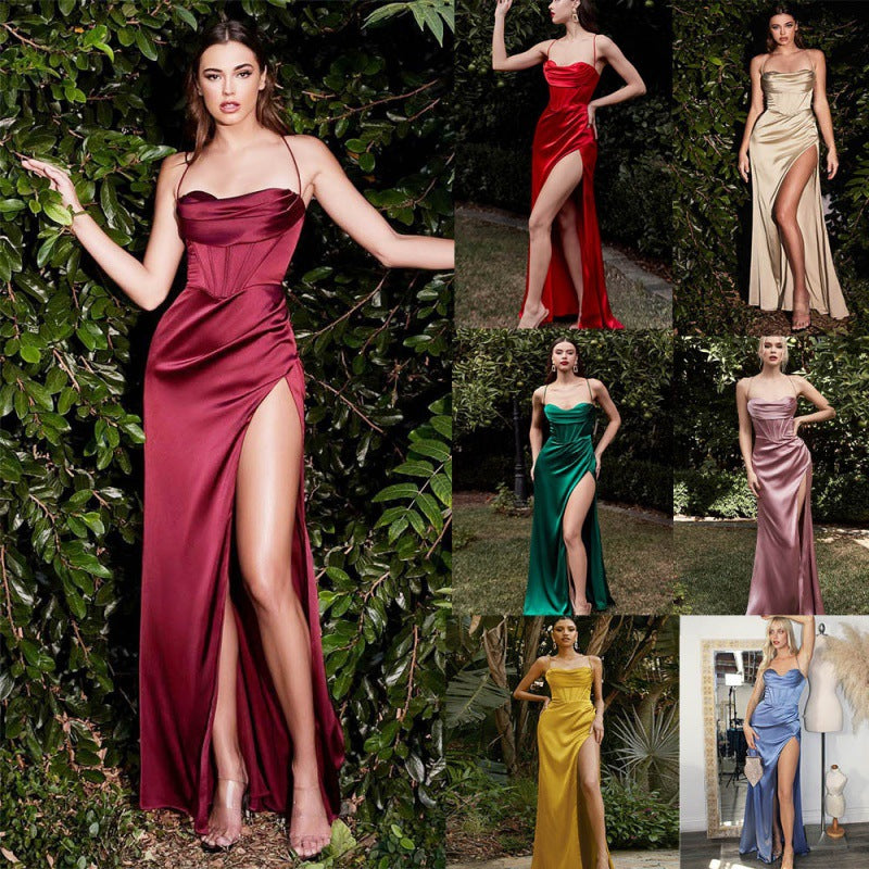 Vervollständigen Sie Ihre nächtliche Garderobe mit diesem verführerischen und schlanken seidigen Maxi -Kleid für Frauen mit herzhaftem Ausschnitt und Oberschenkelschlitz. Es kommt in mehreren edlen Farboptionen.