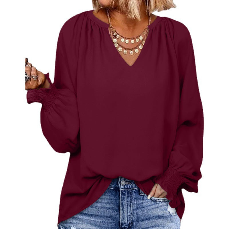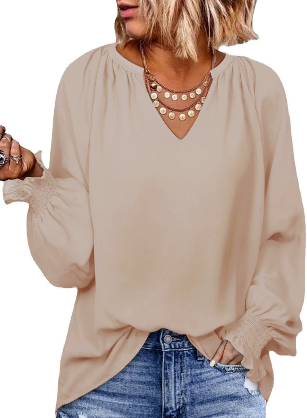 Seidiges Langarm-Shirt mit V-Ausschnitt und gerafften Details