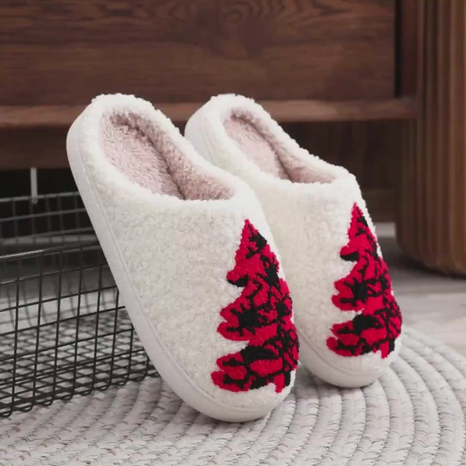 Soft Fleece Lined House Slippers with Red and Black Christmas Trees