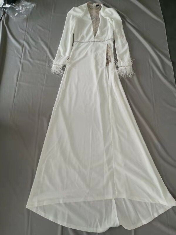 Sehen Sie königlich und raffiniert aus in diesem Damenkleid mit steilem V-Ausschnitt, transparentem Mieder, langem Maxi-Saum und Oberschenkelschlitz. Es verfügt über zarte weiße Federn, die das Erscheinungsbild des restlichen Kleides ausgleichen.