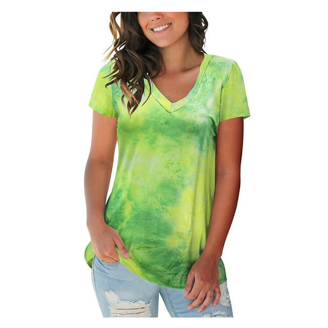 Das Kurzarm-T-Shirt mit Batikmuster für Frauen ist eine Hommage an die Retro-Stile vergangener Zeiten. Es verfügt über mehrere Farbkombinationen und Muster, aus denen Sie wählen können, um Ihre Garderobe aufzupeppen.