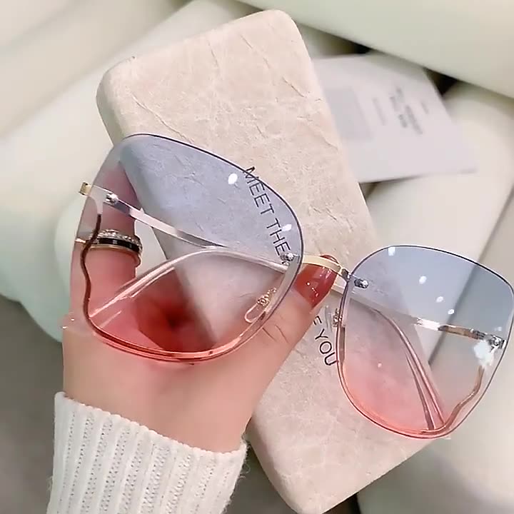 Eine schöne Ombre-Farbmischung charakterisiert die vielen Linsenoptionen der übergroßen rahmenlosen Kunststoff-Ombre-Casual-Sonnenbrille. Diese Brille ist mit ihrer großen Größe und den unkonventionellen Linsenfarben voller Persönlichkeit.