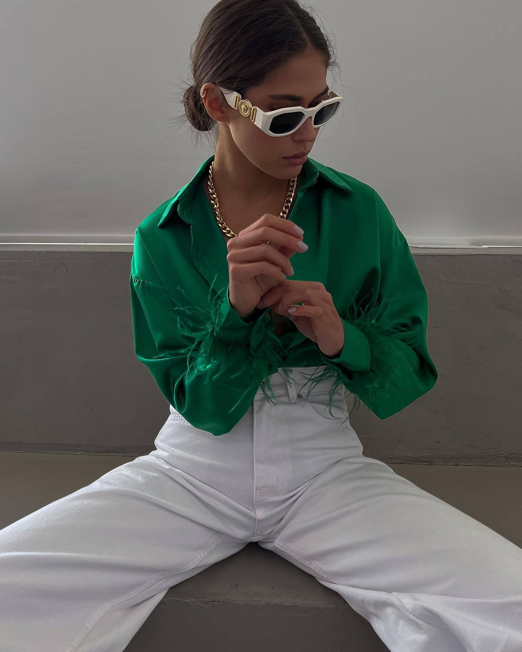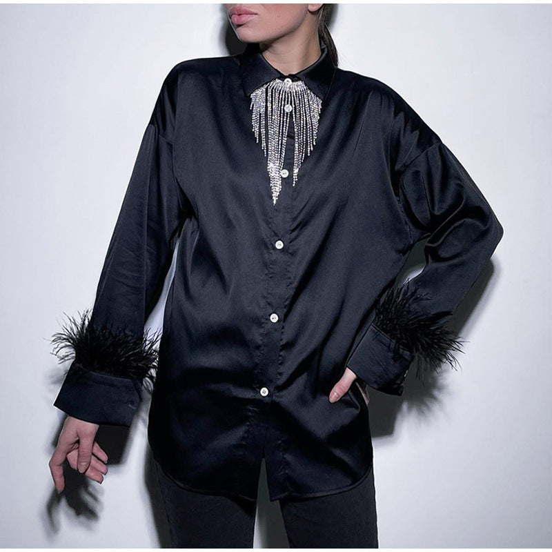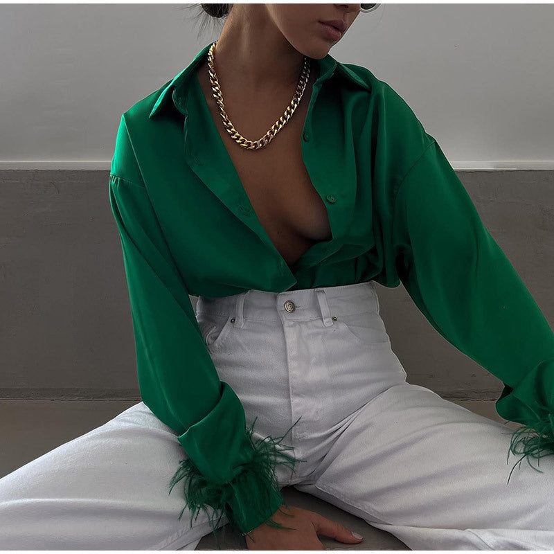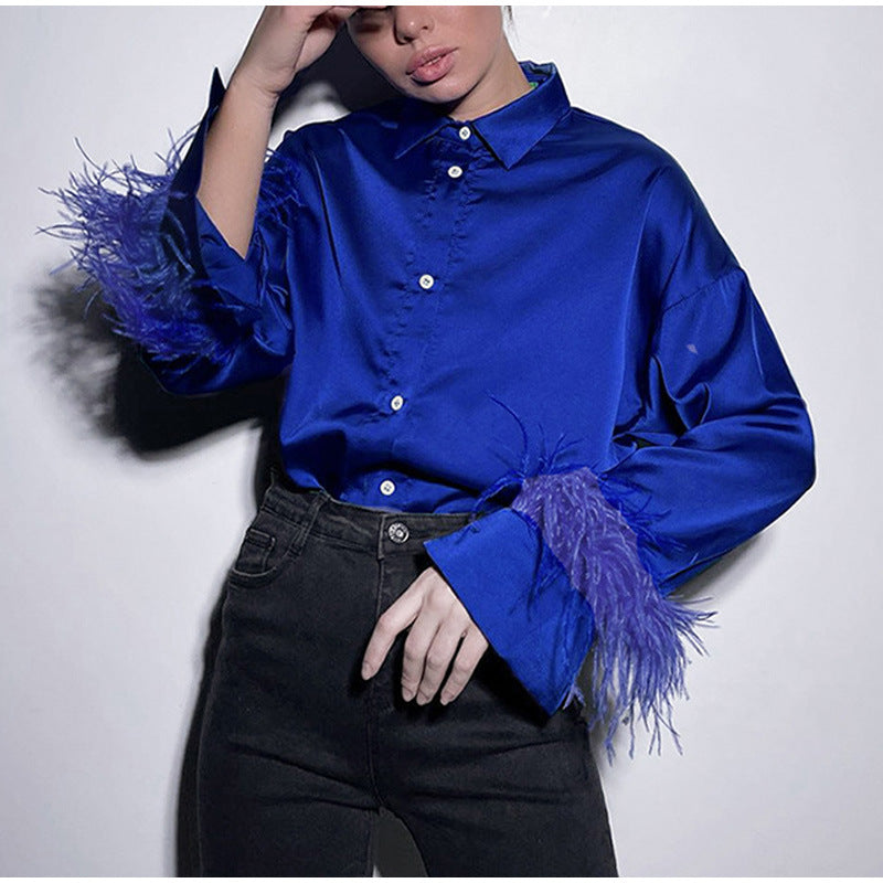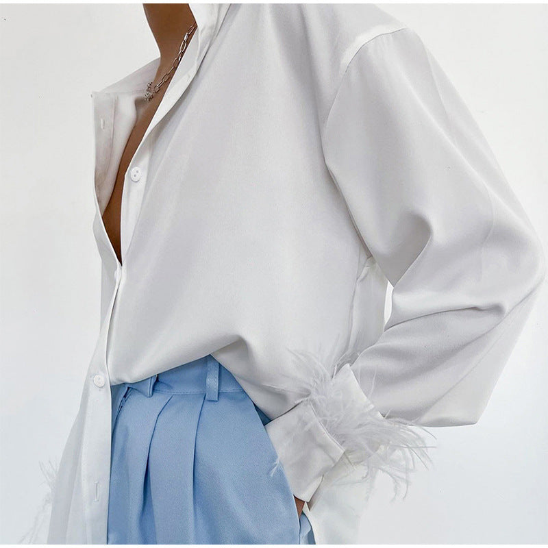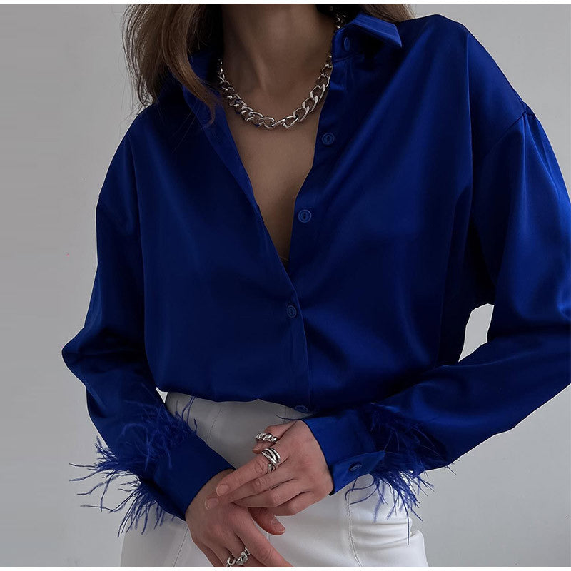 Erhöhen Sie den Look Ihrer Business-Casual-Kleidung mit der langärmligen Damenbluse mit V-Ausschnitt und Knöpfen und Federn, die feine Federn entlang der Handgelenke aufweist. Wählen Sie aus einer von vier Farben.