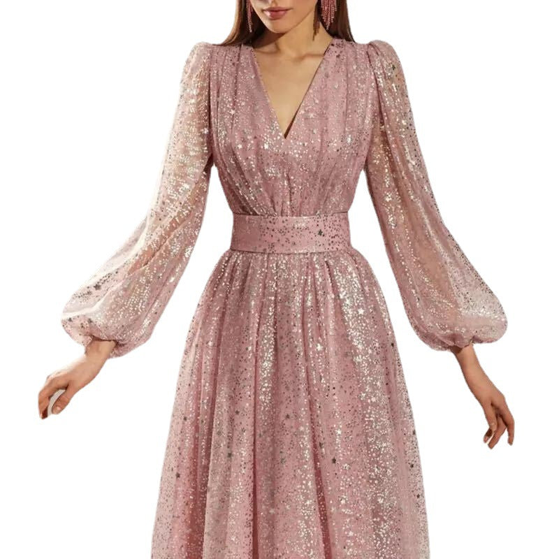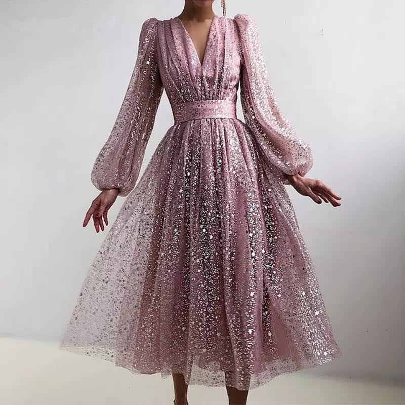 Sehen Sie bei Ihrem nächsten formellen Event wie eine Prinzessin aus, indem Sie das langärmlige Ballkleid mit V-Ausschnitt und Puffrock für Damen tragen. Das Design besteht aus transparentem Material und glitzernden Akzenten, die es glänzen und funkeln lassen.