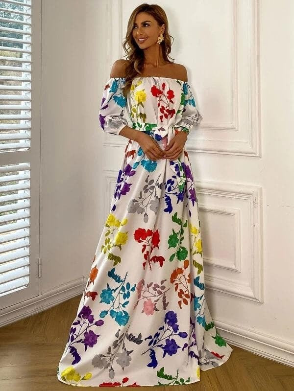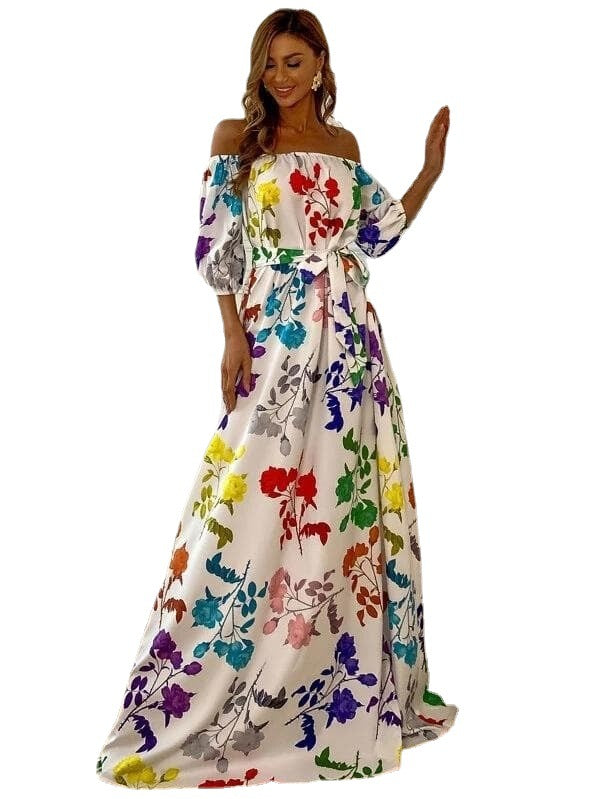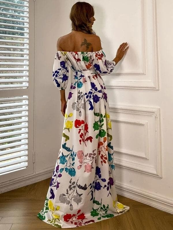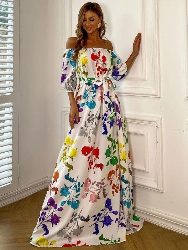 Das lebendige weiße ärmellose schulterfreie Damenkleid mit Maxi-Saum und botanischem Regenbogenmuster ist eine verspielte und skurrile Ergänzung zu Ihrer Sommergarderobe. Es hat schulterfreie Ärmel, die bis zum Unterarm reichen.