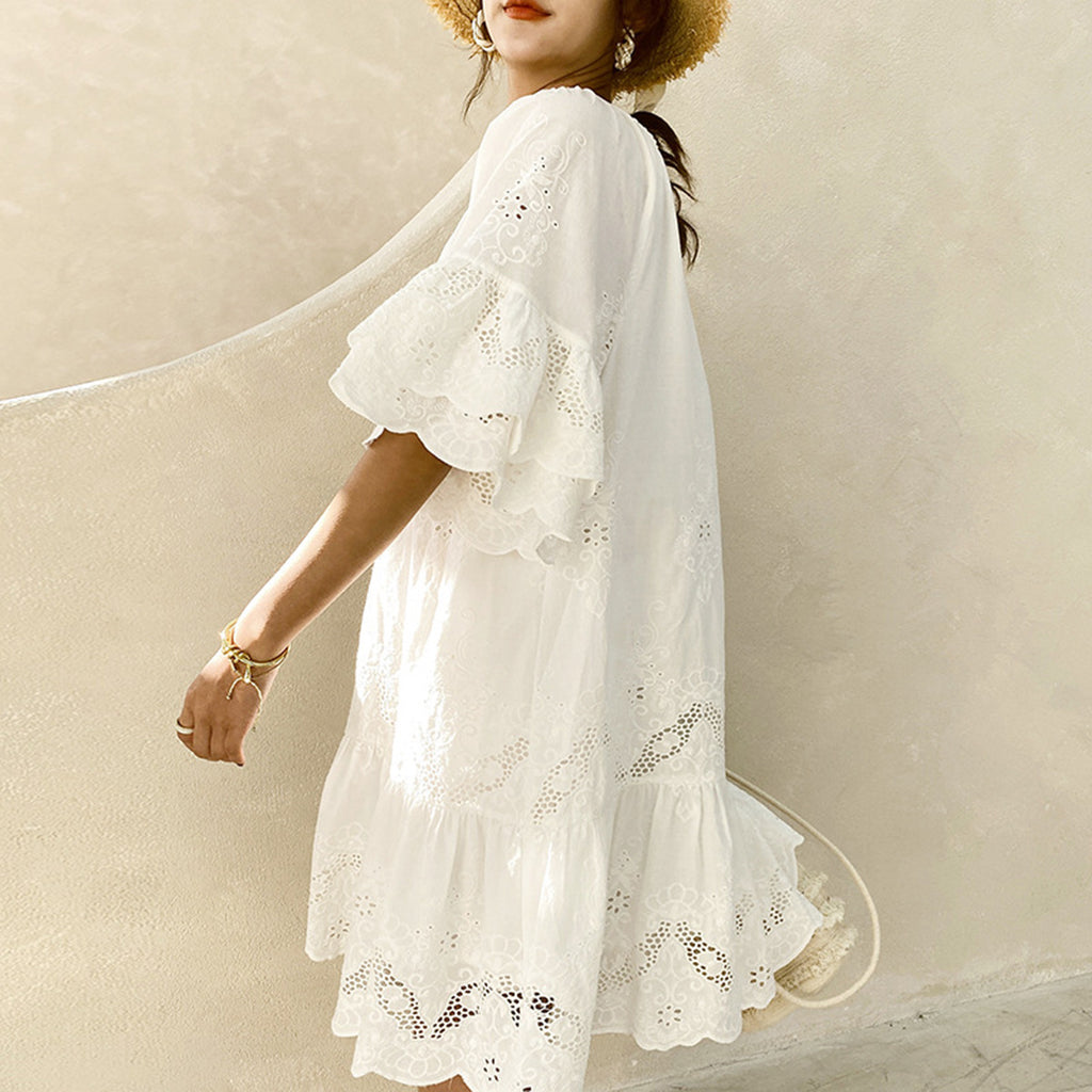 Das weiße Gehrockkleid für Damen mit Spitzenausschnitten und kurzen Ärmeln ist eine schöne Wahl für jeden warmen, luftigen Sommertag. Es hat einen Schlüssellochausschnitt und lockere Ärmel, die ihm einen lässigen Look verleihen.