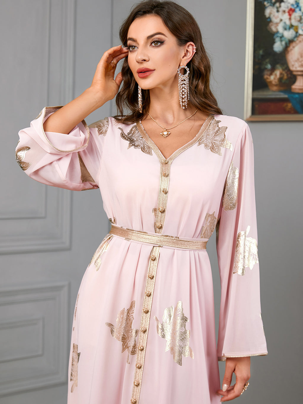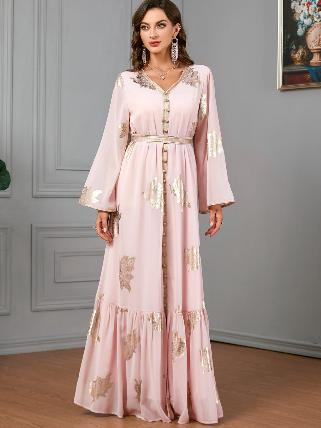 Women's Long Bell Sleeve Maxi Dress with Gold Trim