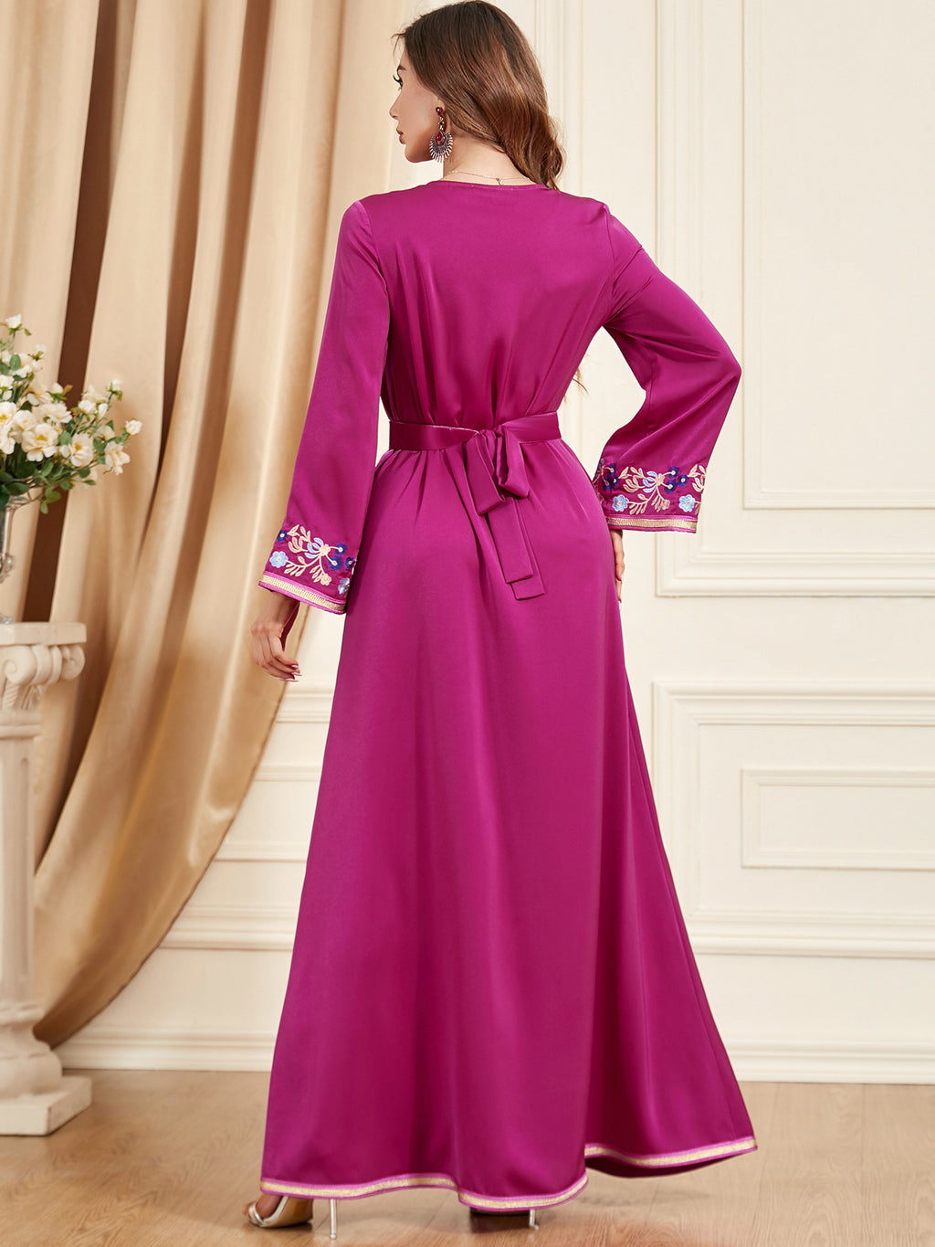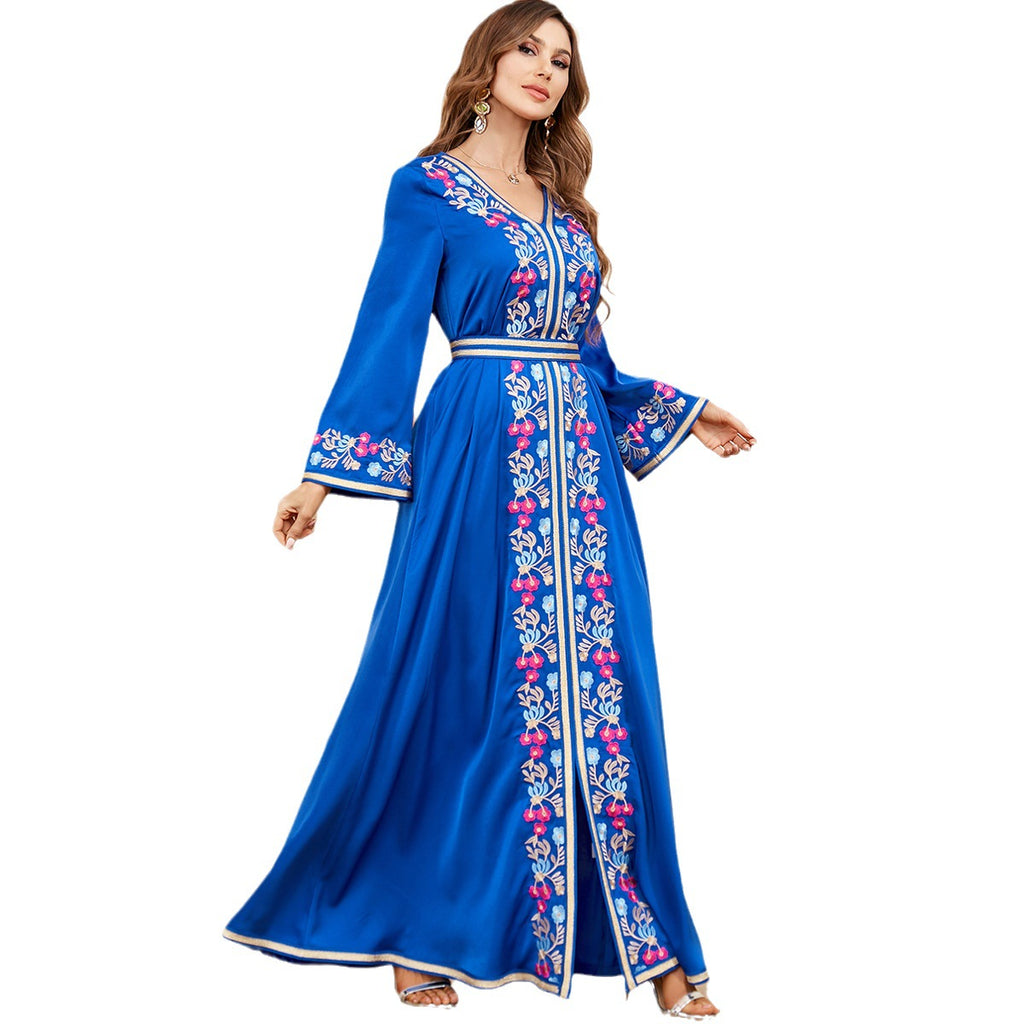Colorful and vivid, the Women's Long Sleeve Midnight Blue Floral Maxi Dress features vibrant hot pink and sky blue floral details for a well-rounded appearance.