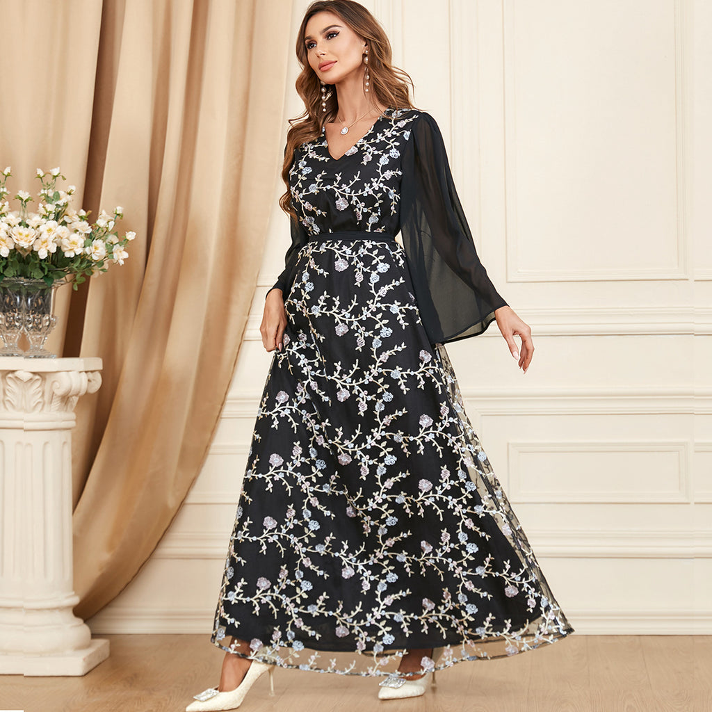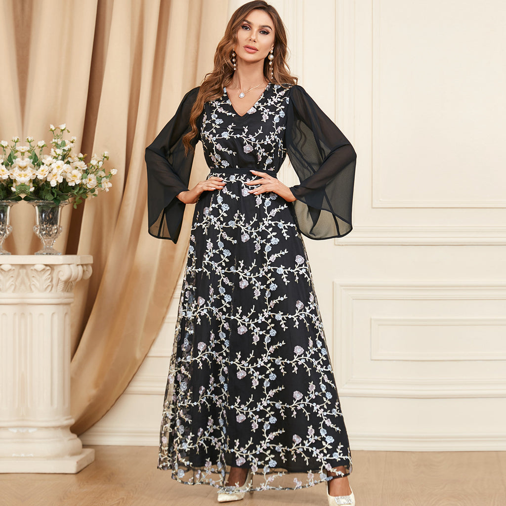 Shimmer like the night sky wearing the Women's Long Sleeve Navy Blue Floral Maxi Dress. This gown features silvery vine and rose details that contrast like stars in the night sky.