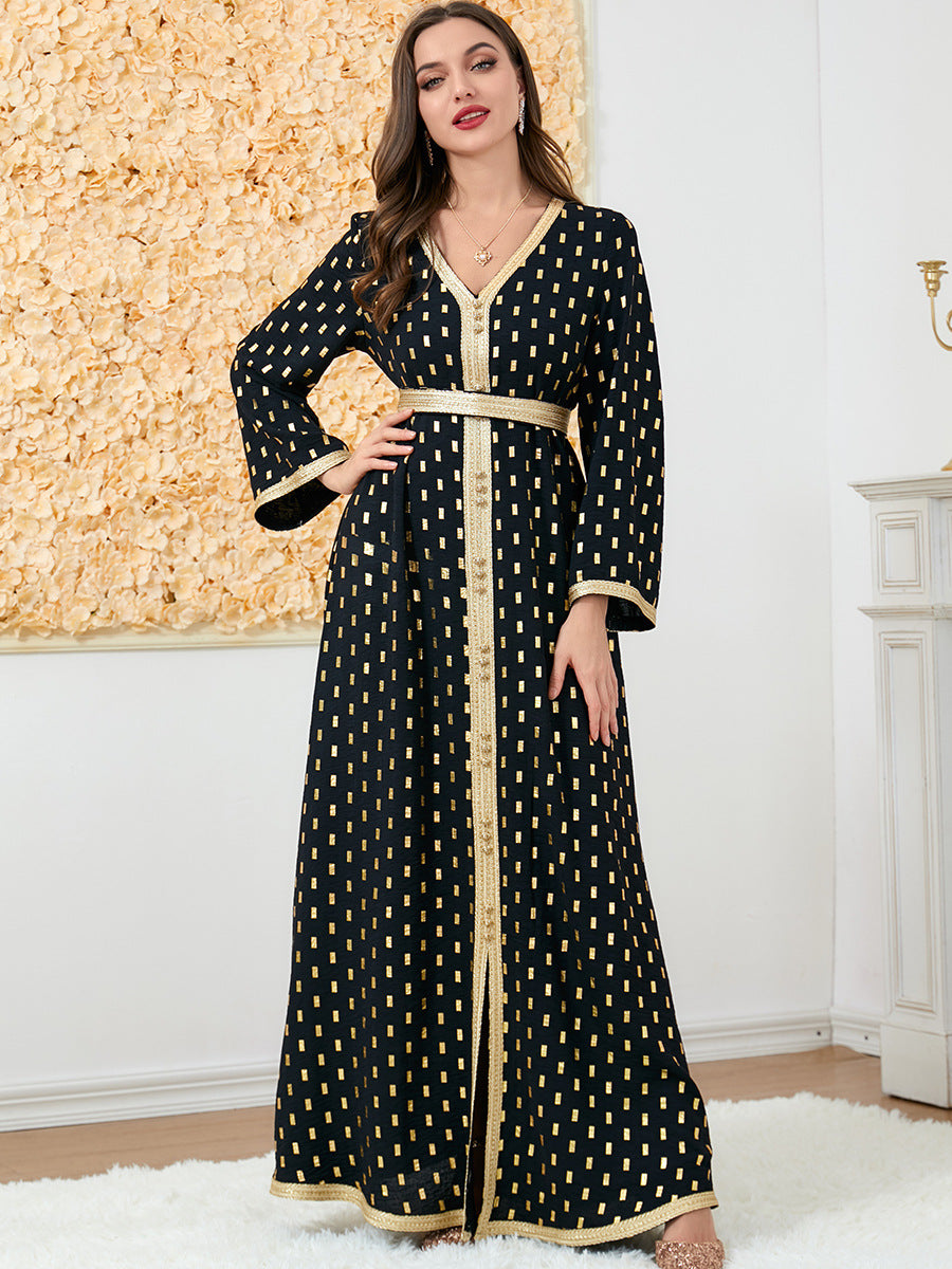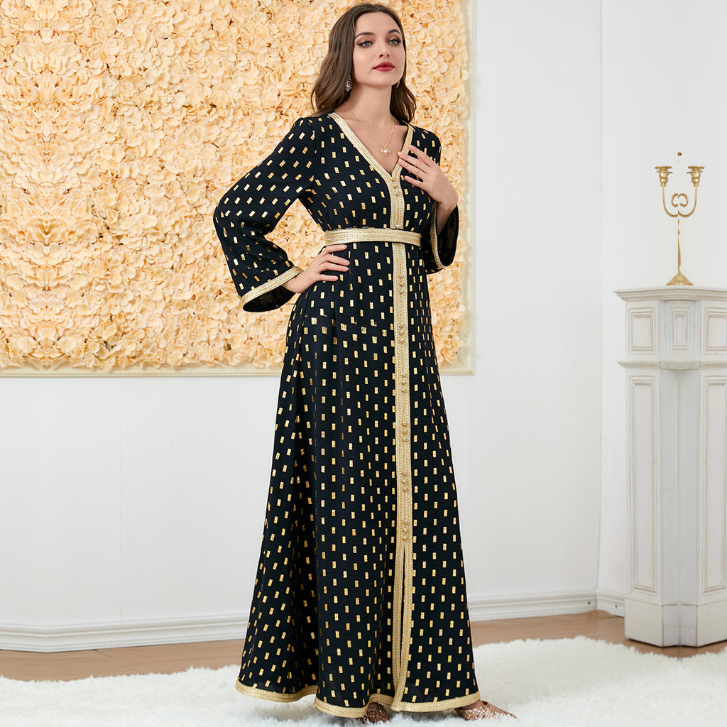 Grab attention in the shimmering Women's Long Sleeve Navy Blue Maxi Dress complete with golden polka dots and a golden split down the center.