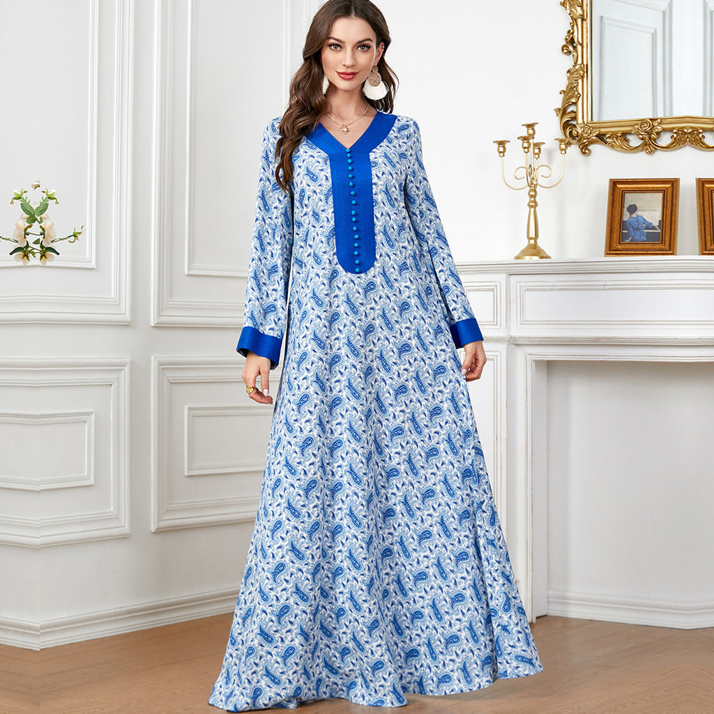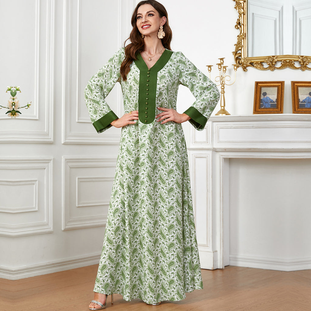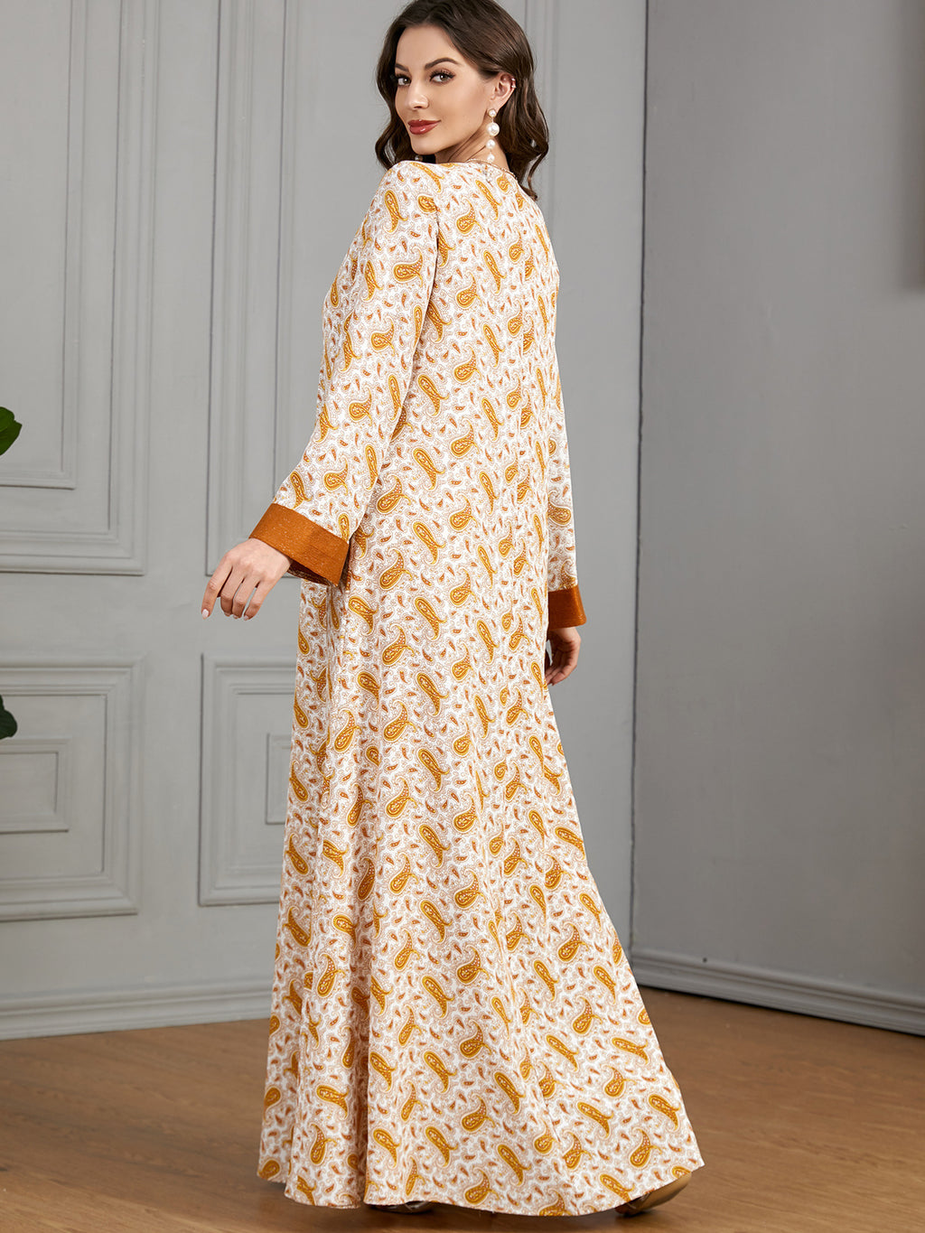 Women's Long Sleeve Patterned Maxi Dress with Decorative Buttons