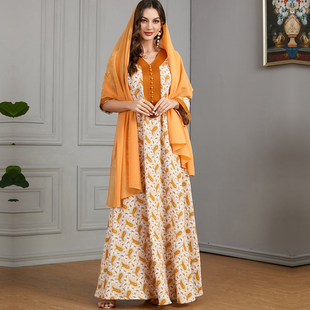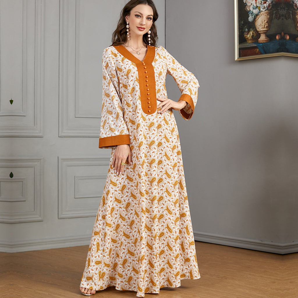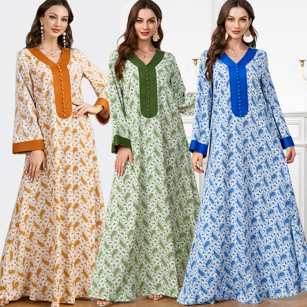 Women's Long Sleeve Patterned Maxi Dress with Decorative Buttons