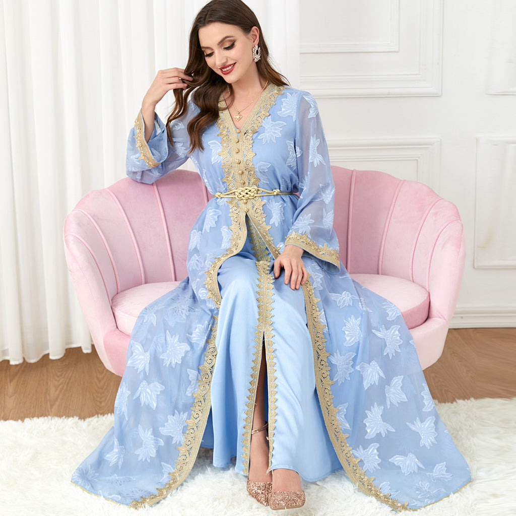 The Women's Long Sleeve Semi-Sheer Floral Dress with Gold Trim is a dainty and gorgeous gown for any occasion. It comes in your choice of four colors.