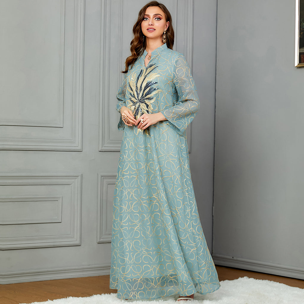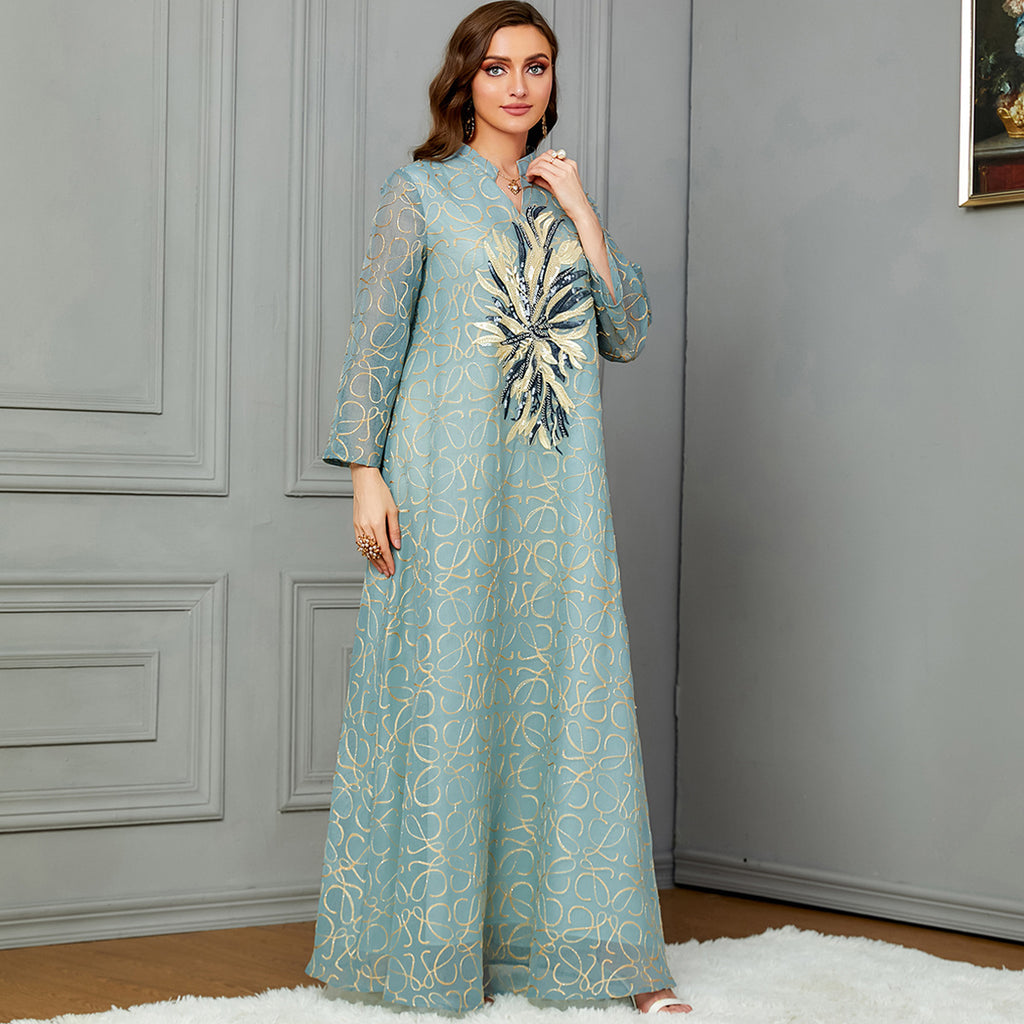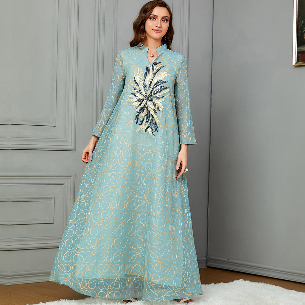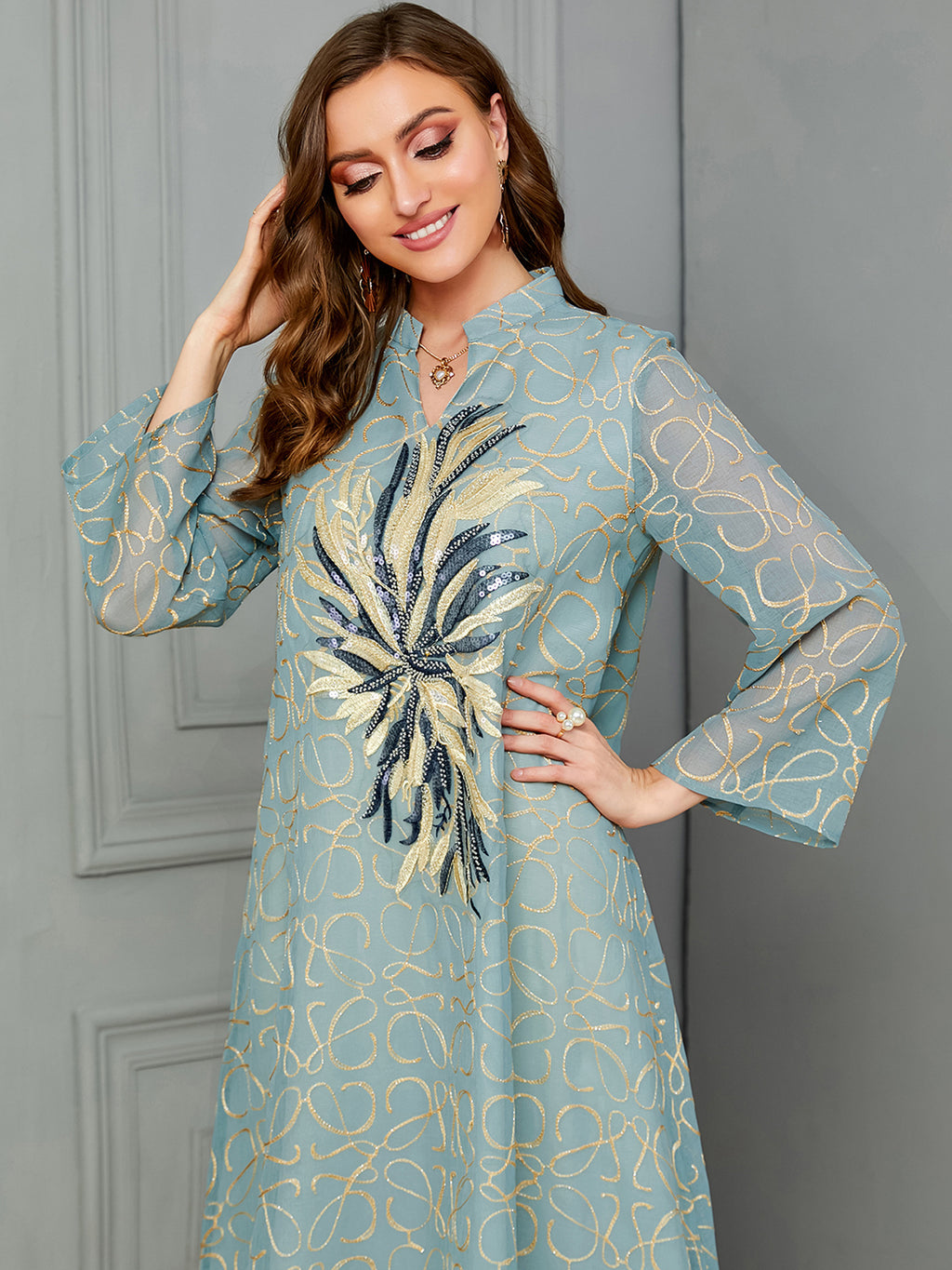 Sparkle in the light wearing the Women's Long Sleeve Semi-Sheer Maxi Dress. It features subtle gold swirls along the light blue fabric as well as a stylish mock neck collar.
