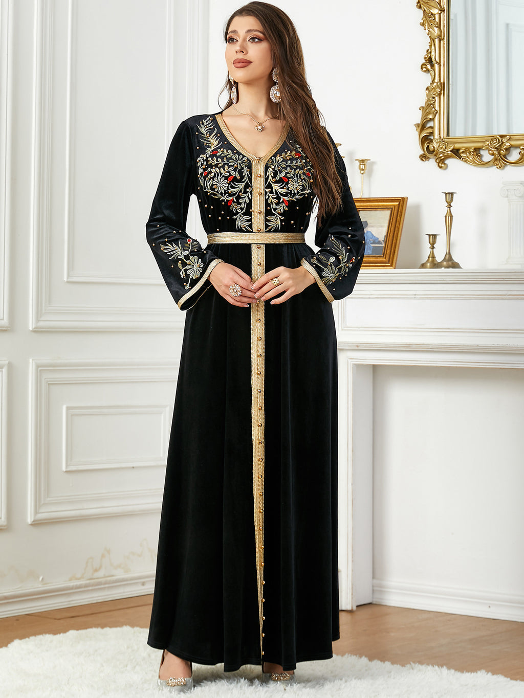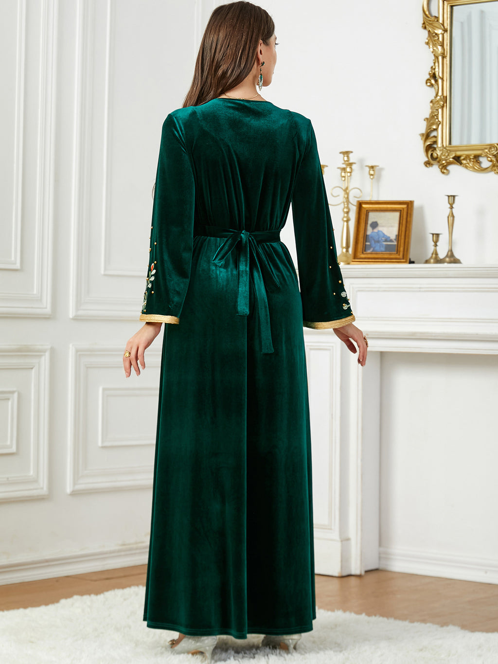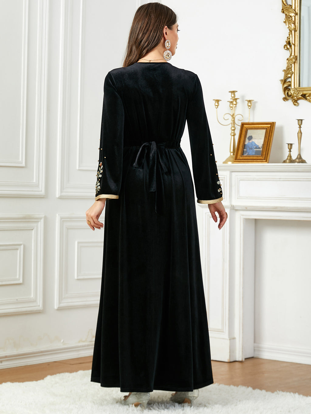 Women's Long Sleeve Velvet Maxi Dress with Gold Trim