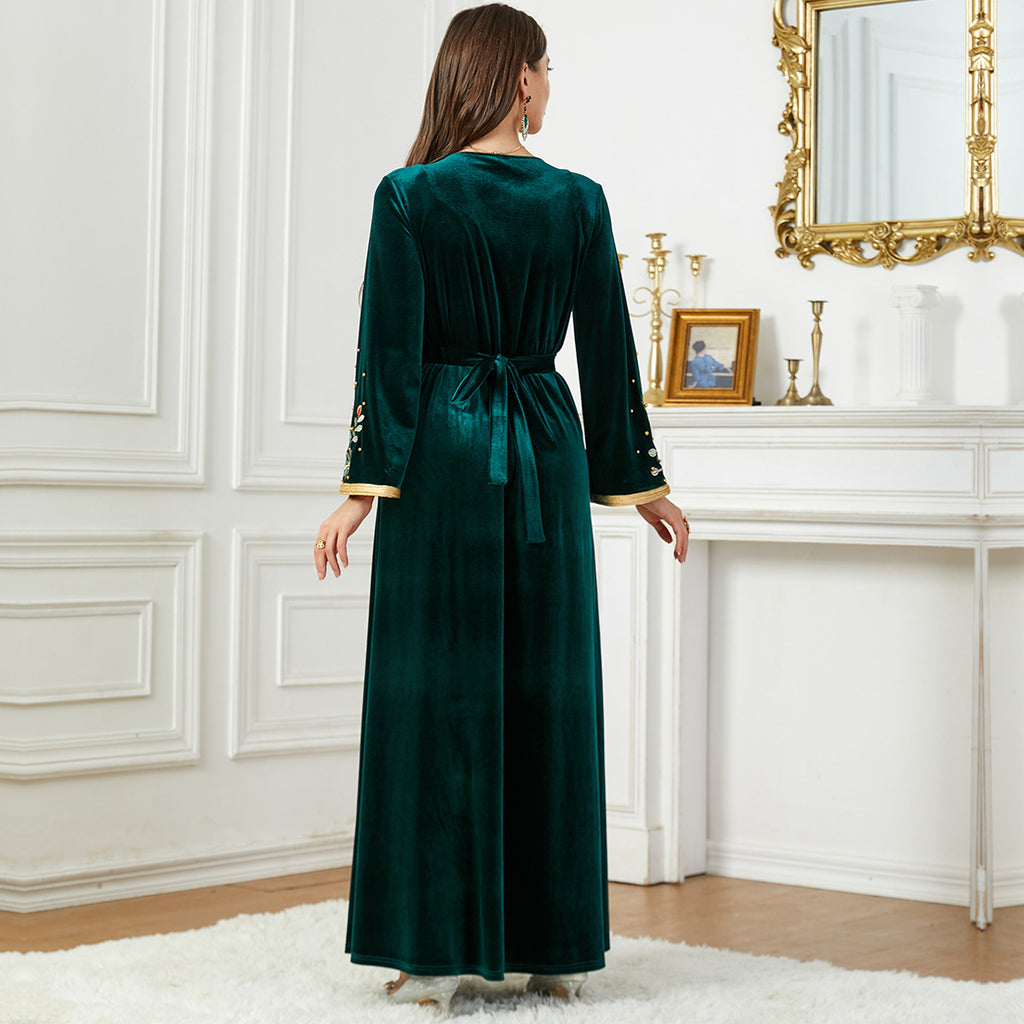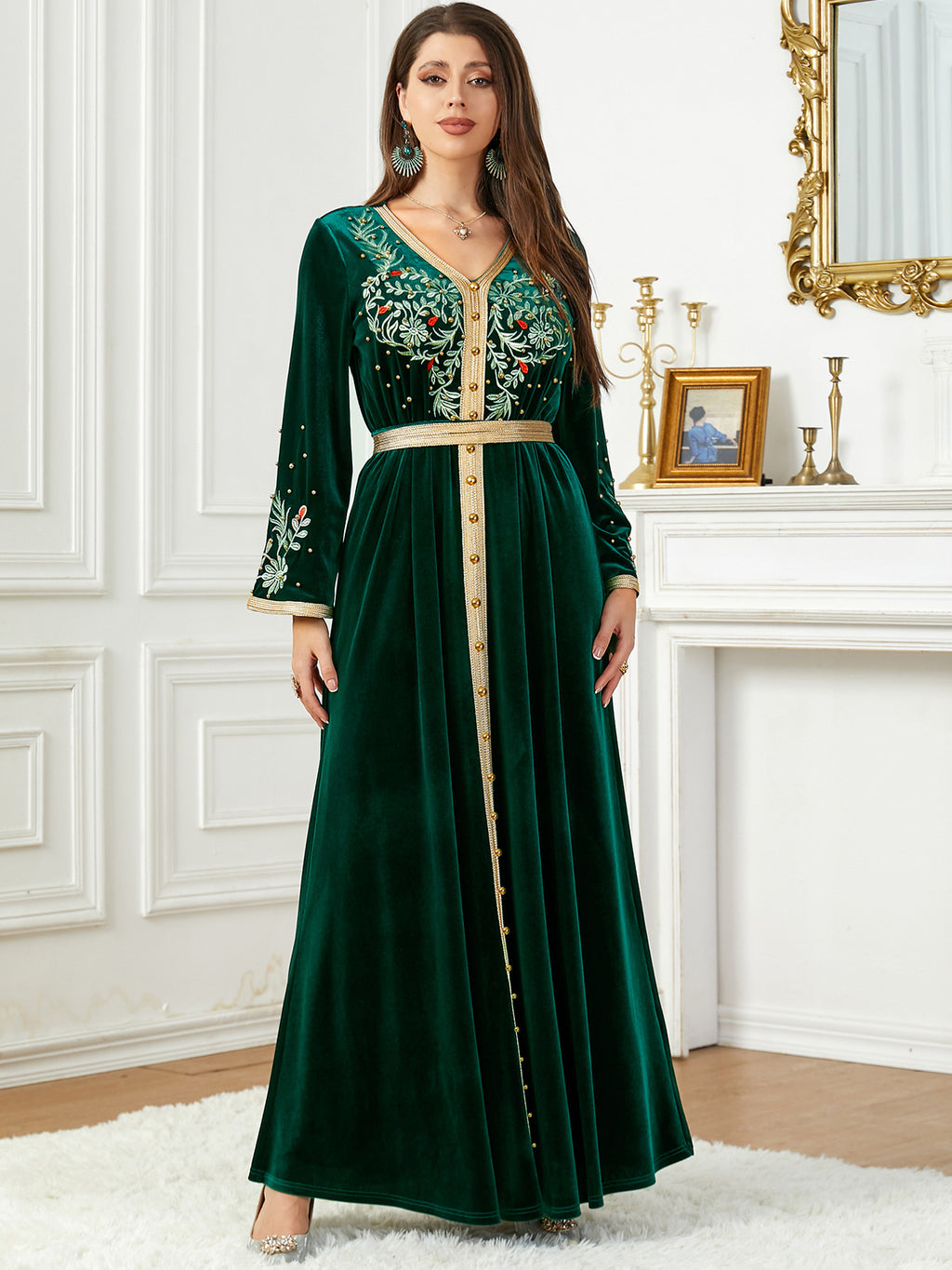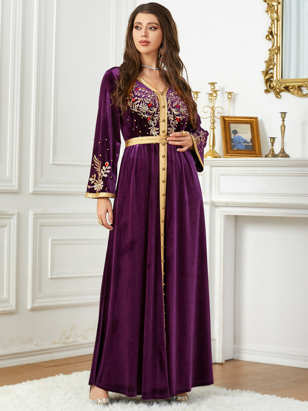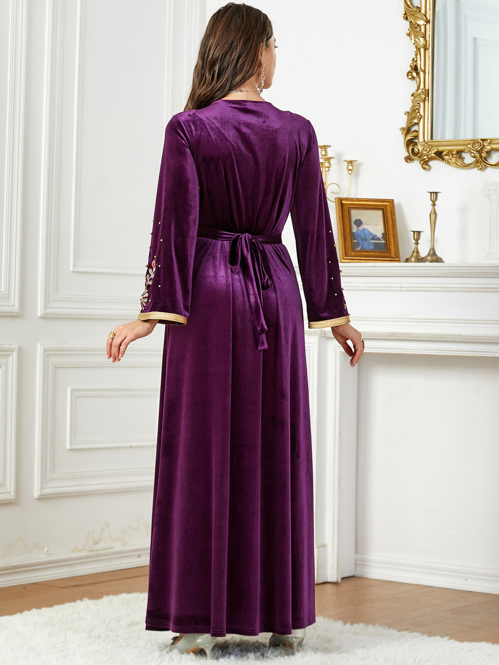 Women's Long Sleeve Velvet Maxi Dress with Gold Trim