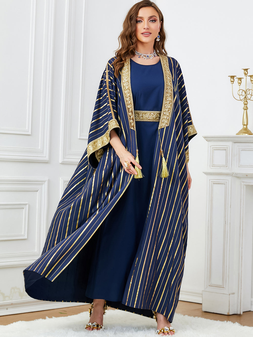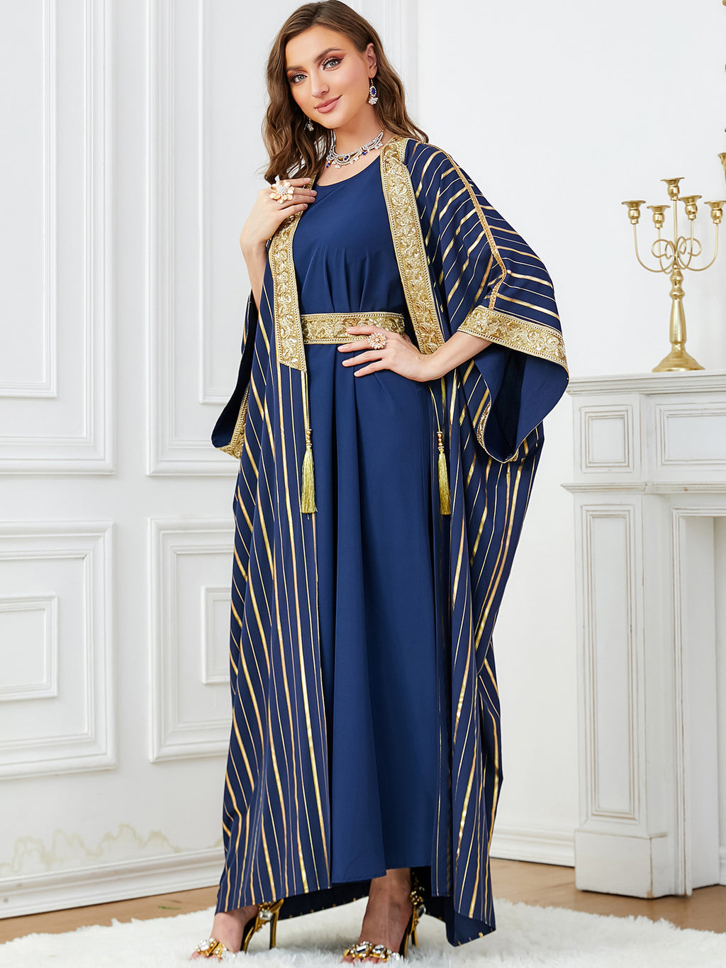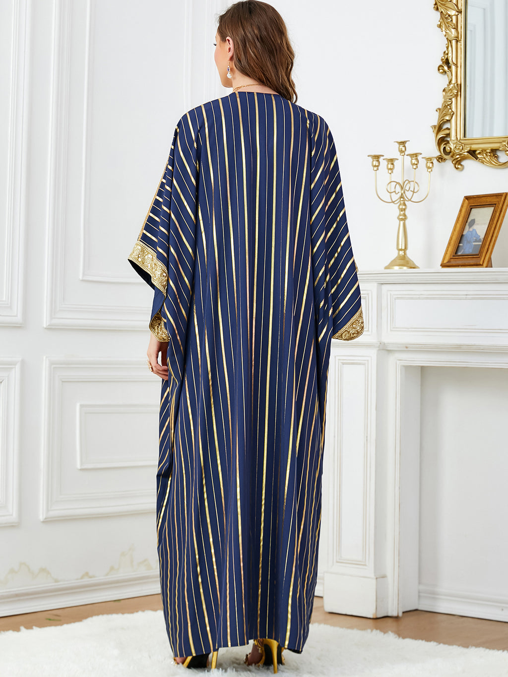 Wearing the Women's Loose Fitting Poncho Sleeve Maxi Dress, you’ll feel comfortable, cool and beautiful. It consists of vertical blue and gold stripes.