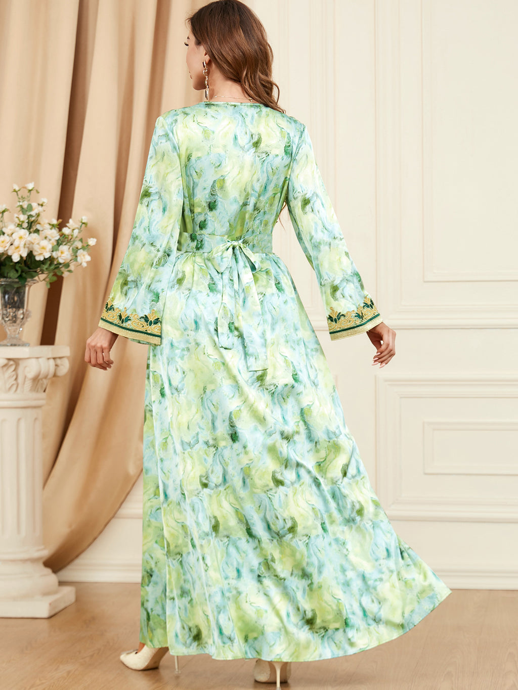 Bring a regal look to your nighttime wardrobe by wearing the Women's Mint and Navy Blue Maxi Gown complete with sophisticated gold trim.