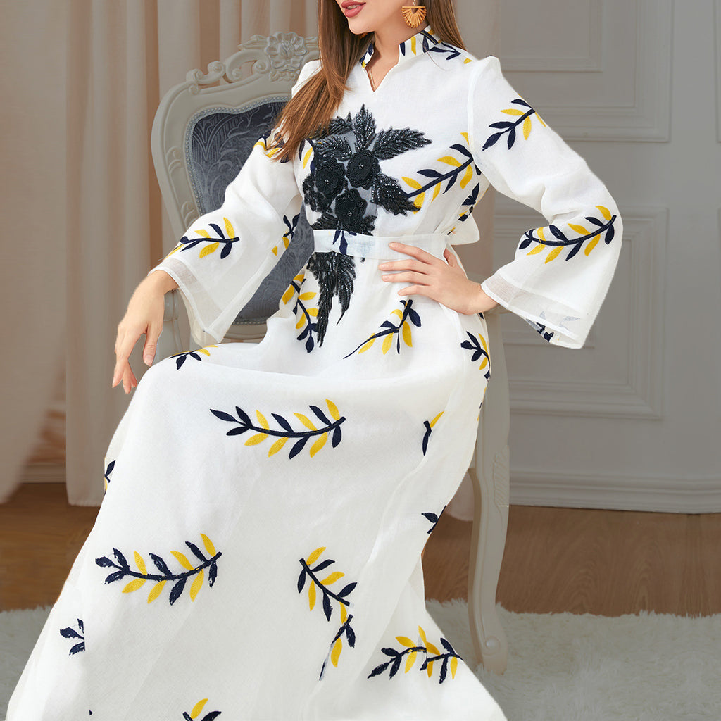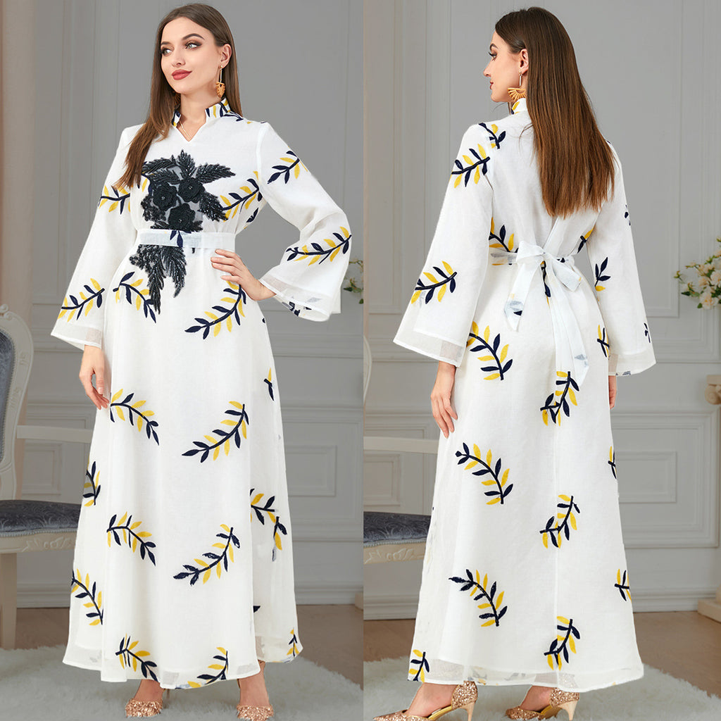 Spruce up your springtime ensembles with the Women's Mock Neck Long Sleeve Botanical Print Maxi Dress featuring a unique blue lace patch on the bodice.