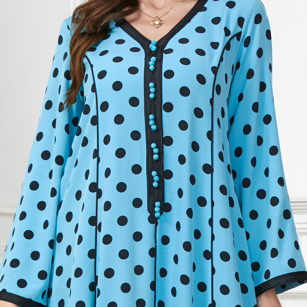 Look sunny and chic in the Women's Pale Yellow Maxi Dress with Black Polka Dots. This loose-fitting dress features long sleeves and a flowy hemline.