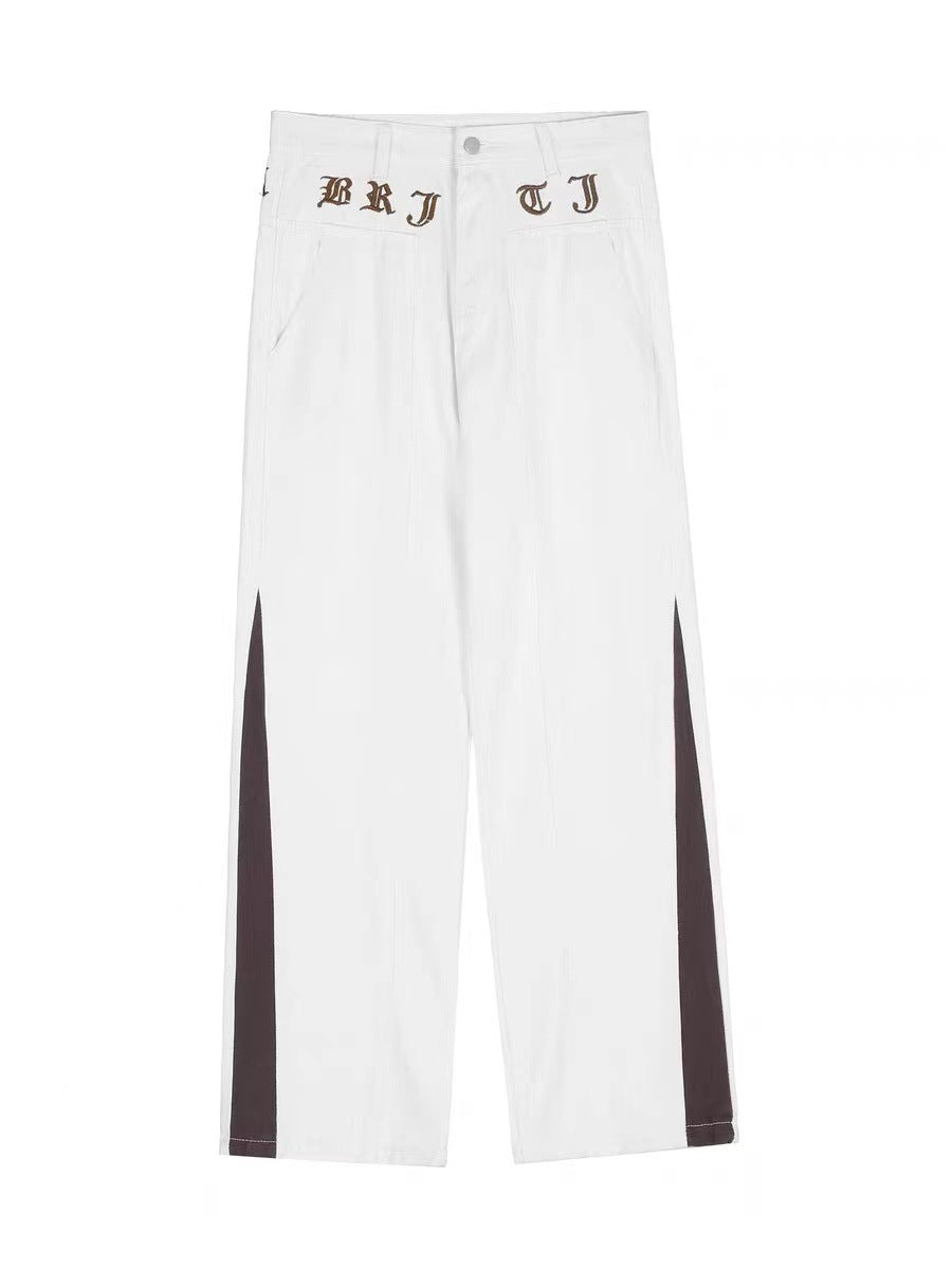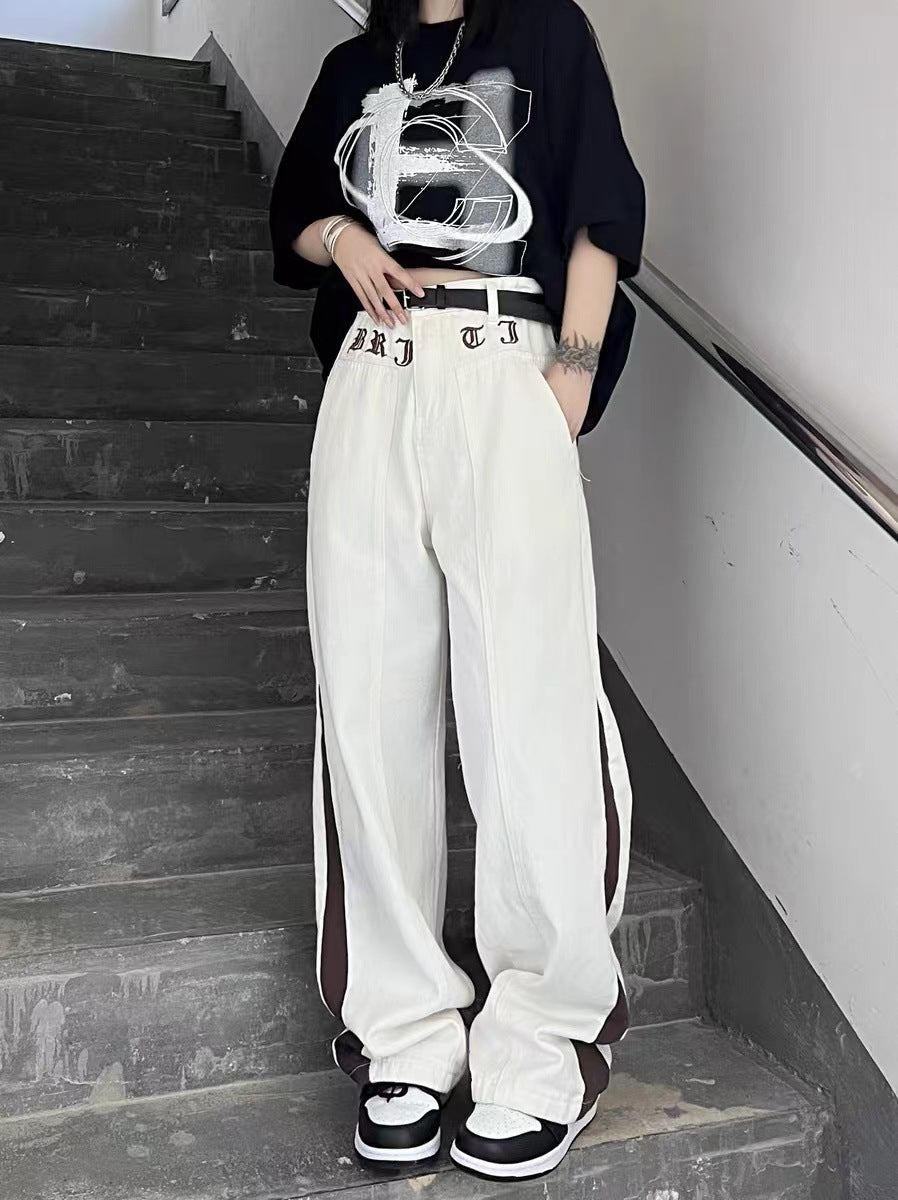 Elevate your daily style wearing the Women’s Wide Leg Loose Fitting Pants featuring a white color scheme with strips of dark brown around the calves.