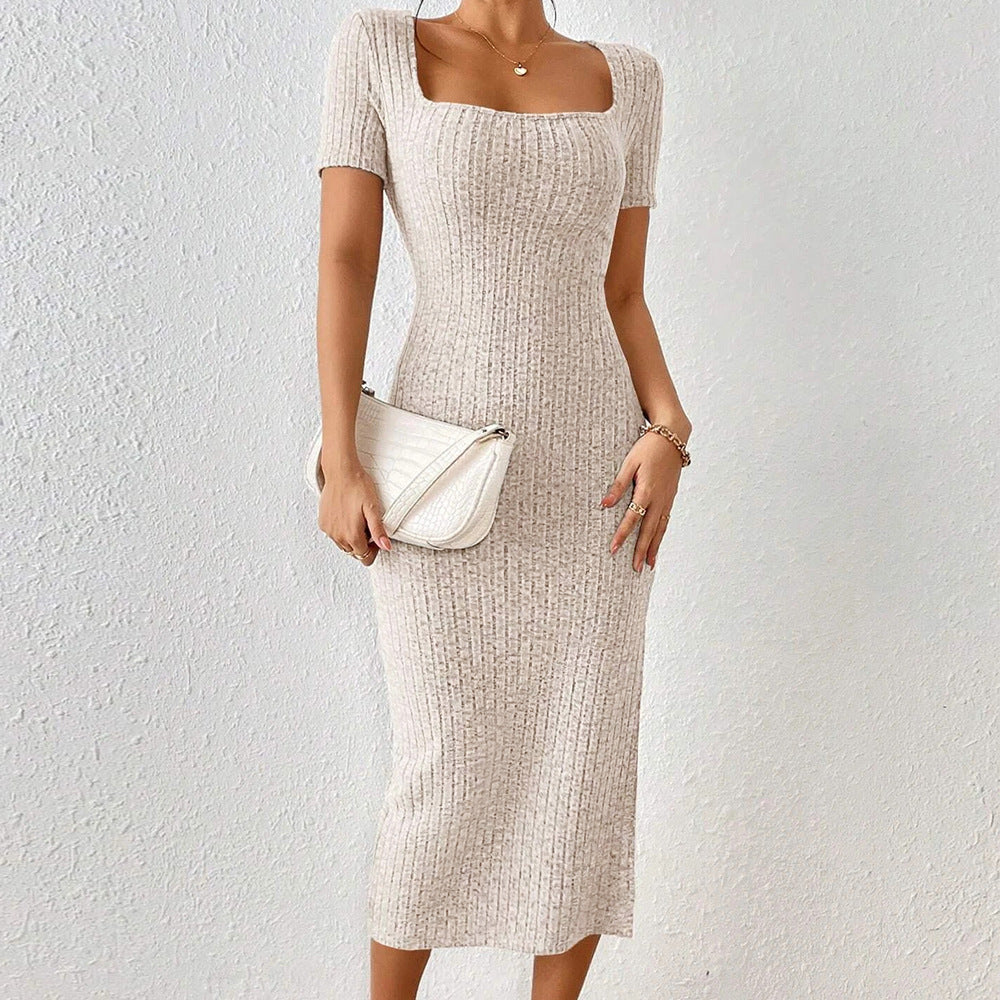 Show off your shape in this Women's Casual Short Sleeve Dress with U Neck and Thigh Slit. It features a knitted texture that makes it great for fall.