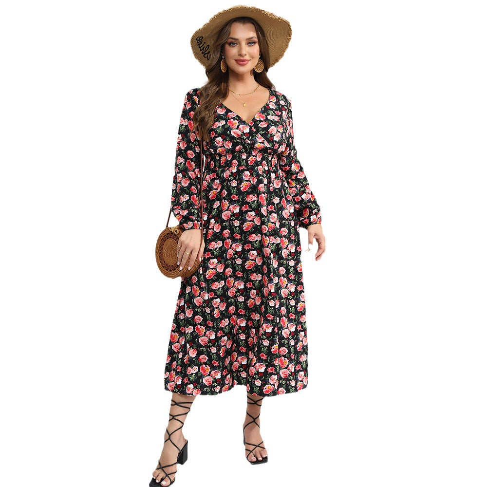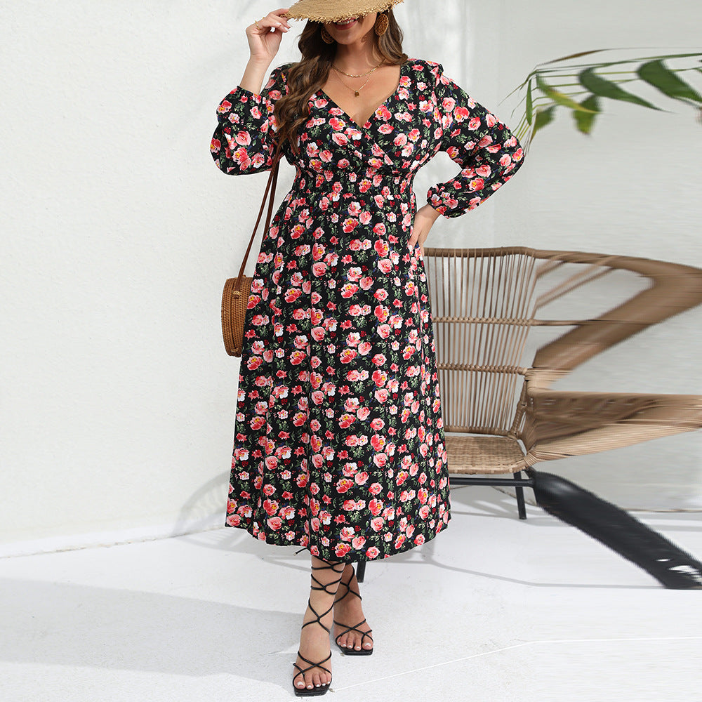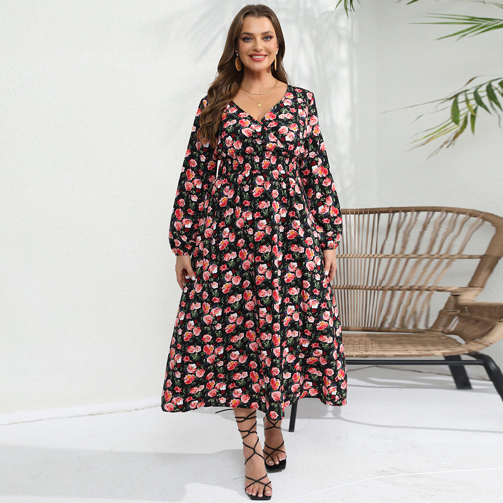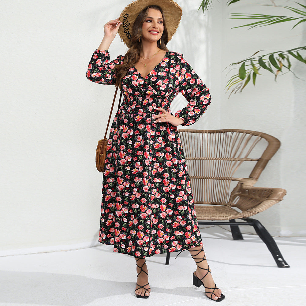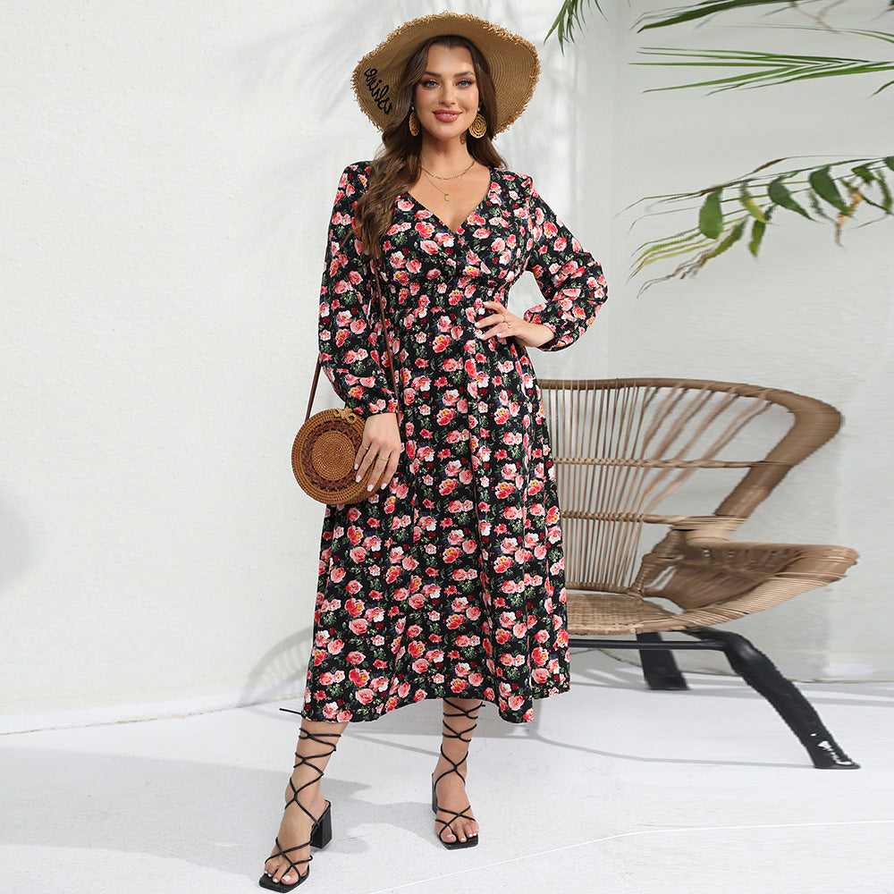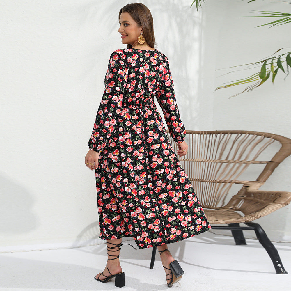 Women's Long Sleeve V Neck Floral Print Maxi Dress
