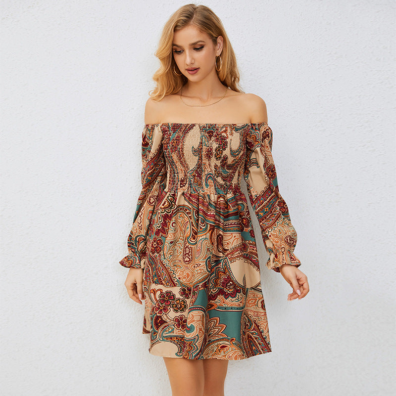 Look stylish in earth tones and paisley print wearing the Women's Off the Shoulder Long Sleeve Midi Dress featuring brown, crimson, orange and teal hues.