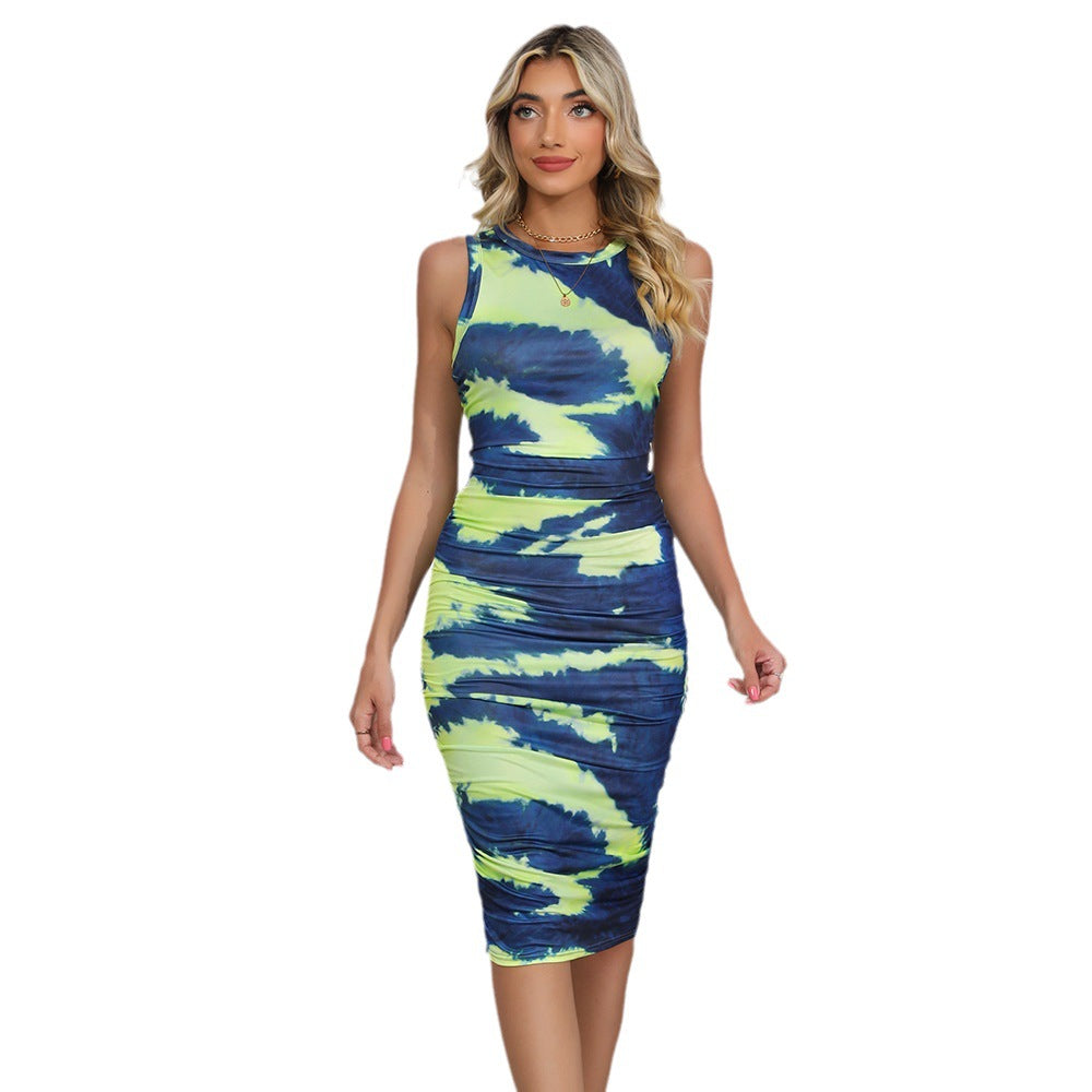 Vibrant and colorful, this Women's Sleeveless Form Fitting Midi Dress features a tie-dye style pattern in lime green and dark blue, offering striking contrast.