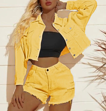 Perfekt für Sommer und Frühling, mit diesem zweiteiligen Set aus Jeansjacke und Shorts für Damen können Sie im Handumdrehen ein schickes und süßes Outfit zusammenstellen. Es steht in mehreren Farboptionen zur Auswahl.